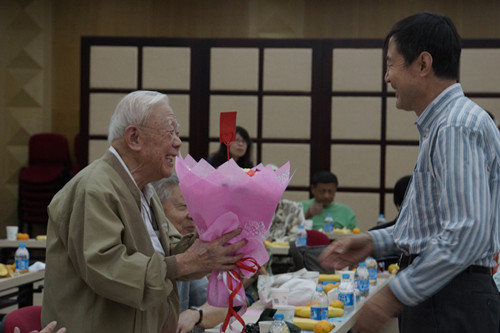 之后,在郝卫东书记的主持下,院领导分别向90岁高龄的曹家琪和王黎华两位教授、80岁高龄的沈慧麒和周庆光两位教授敬献鲜花,并向四位教授祝贺寿辰,同时请各位教授切开生日蛋糕,与到会全体老师们分享美好祝福。