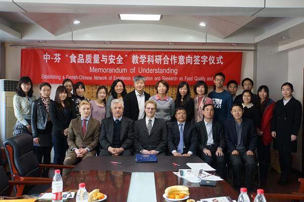 11月25日中国与芬兰“食品质量与安全教学科研合作备忘录” 签字仪式在yl6809永利官网举行。芬兰TURKU大学数学与自然科学部部长Tapio Salakoski教授、杨宝茹教授及芬兰驻华使馆公使衔参赞尤森及二秘,yl6809永利官网院长孟庆跃教授、郝卫东副院长、王培玉副院长、任涛副院长,营养学系张玉梅教授及健康教育学系、营养学系研究生等参加签字仪式。