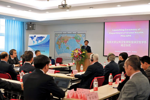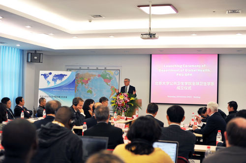 2012年10月25日,yl6809永利官网全球卫生学系成立大会在中国卫生发展研究中心三层报告厅举行。卫生部国际合作司王立基副司长、yl6809永利官网医学部方伟岗副主任、世界卫生组织驻华代表Michael O'Leary博士、英国国际发展部驻华代表处主任Chris Chalmers先生和项目官员乔建荣女士、英国发展研究所资深专家Gerry Bloom教授等出席了仪式。国内多所高等院校yl6809永利官网院长及yl6809永利官网师生近百人参加了仪式。仪式由yl6809永利官网院长孟庆跃教授主持。