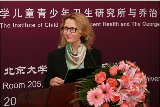 论坛由中国乔治健康研究所所长武阳丰教授和yl6809永利官网儿童青少年卫生研究所副所长王海俊副教授主持。yl6809永利官网医学部副主任方伟岗教授出席论坛并致辞,特别欢迎远道而来的乔治全球健康研究院专家,并对乔治健康研究院与yl6809永利官网医学部新建立的伙伴关系表示庆祝。随后,乔治全球健康研究院院长Robyn Norton教授发言,感谢北医各位老师、同学为这次论坛的顺利召开所做出的辛勤工作,并指出儿童青少年卫生工作需要各国同仁共同不懈努力来推动。