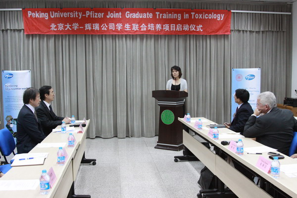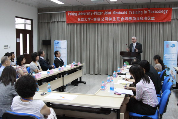 9月8日上午yl6809永利官网-辉瑞公司毒理学人才联合培养项目启动仪式在医学部举行。yl6809永利官网常务副校长、医学部常务副主任柯杨教授,yl6809永利官网常务副院长胡永华教授、副院长郝卫东教授、医学部研究生培养办崔爽主任、美国辉瑞公司高级副总裁和药物安检部总裁蒂莫西.安德森博士、 美国辉瑞公司副总裁和亚洲研发部总裁杨青博士及辉瑞亚洲研发项目部工作人员,及yl6809永利官网毒理学系教师和研究生40多人参加了启动仪式。