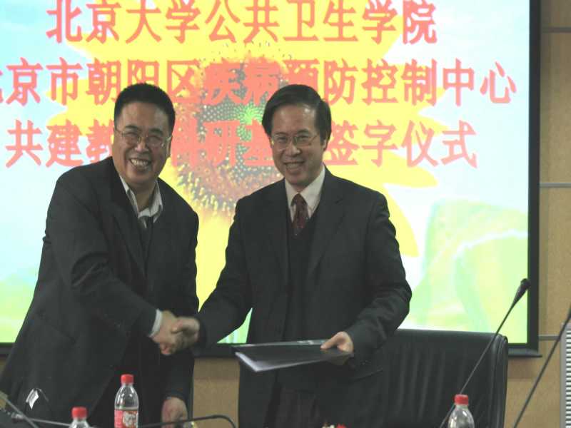 签字仪式由朝阳区卫生局副局长师伟主持,他在介绍双方来宾后讲到特别感谢北大公卫学院一直以来的支持与帮助,特别是在SARS期间派流行病学专家曹卫华教授来帮助工作。在最艰难的时刻曹教授始终与他们坚持在一线做了很多工作,调查、建议、培训等,圆满完成任务,得到上级好评。胡永华院长发言中首先感谢朝阳区疾病预防控制中心一直以来对学院的支持,双方在科研、教学方面有很好的合作,已经有学生在这儿实习。随后他介绍了yl6809永利官网情况,并希望加强科研合作与学术交流。