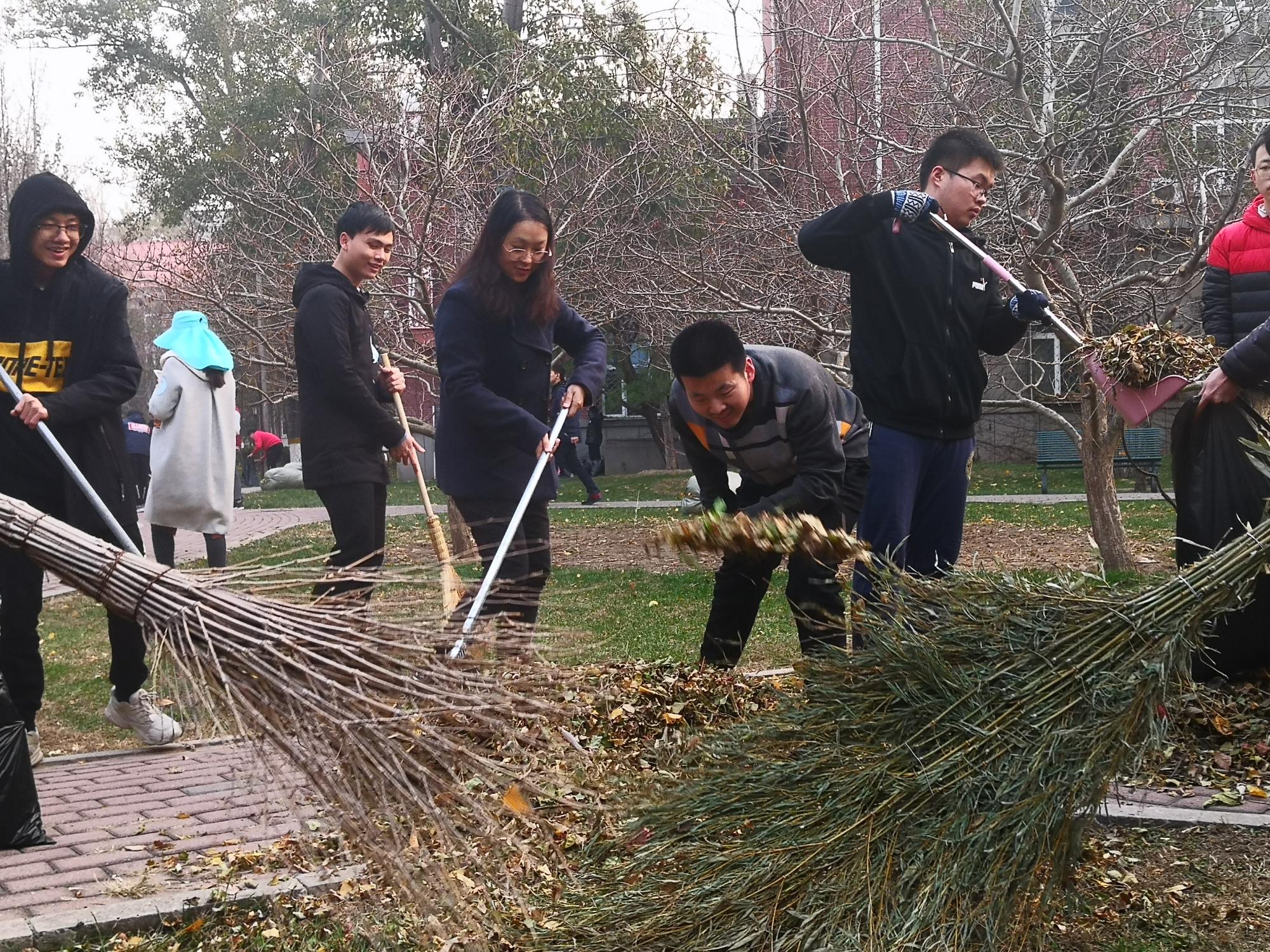这是作为一个中部人在北方度过的第二个秋,依然会由衷感叹这份独属于北方秋天的美丽。我可能见过叶落,但不曾见过这般绚烂却又萧条,和着秋风的金灿灿的“雨”。我们近日常常走在风中,走在“雨”中,走在厚厚的落叶做的“地毯”上,这是初冬的礼物,初冬的美,但洁净是我们长久追求的另外一种美。吹着还算温柔的风,拿着工具,我们体会到了劳动的美,服务的美。以往主要握笔学习,敲键盘工作的双手能够找到另外一种活动方式,以往作为万千被服务的学生中的一员深深体会到了校园环卫工作者每日的辛苦,以往在教室相见的同学难得在校园里一起把劳动搞得热火朝天。看着干净的中心花园,绿油油的草坪,我深深的感到劳动的不易却又幸福。