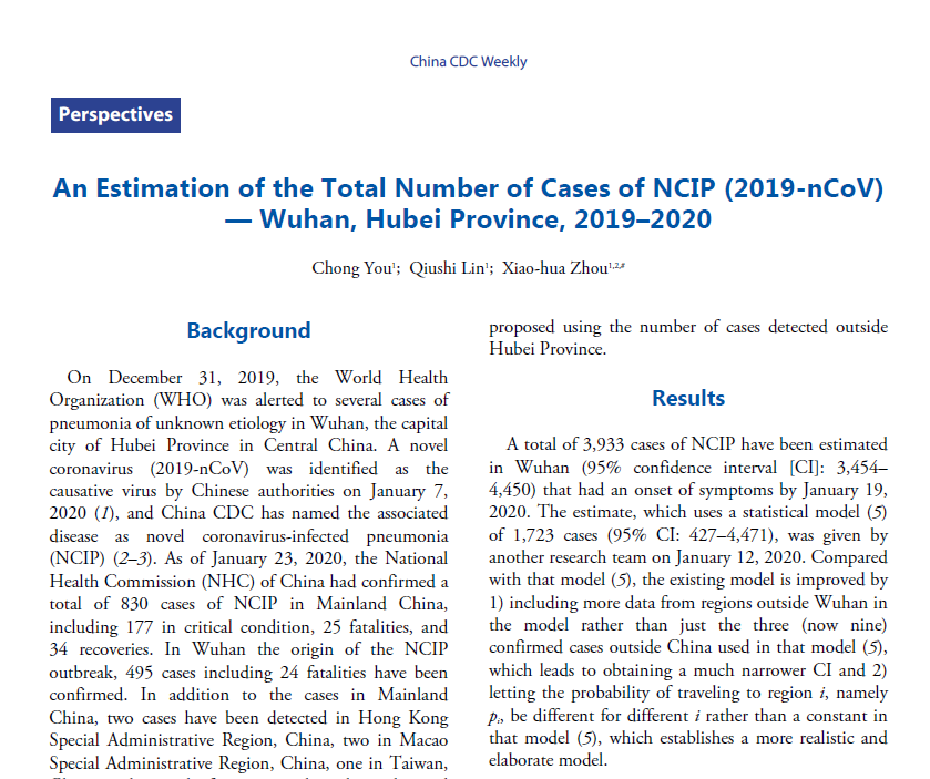 生物统计系尤翀、林秋实、周晓华(发表于《China CDC Weekly》)及林秋实、胡陶钧、周晓华(发表于《Infectious Diseases of Poverty》和《应用数学学报》)对重点感染区域(如武汉等)的感染人数进行数学反推。周晓华团队创新性地综合考虑人口迁移率,病毒的临床特征,结合动力学模型中的基本再生数,提高了对武汉感染人数估计的准确性。