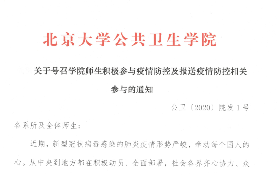 2020年1月以来,新型冠状病毒感染的肺炎疫情形势严峻,牵动每个国人的心。从中央到地方都在积极动员、全面部署,社会各界齐心协力、众志成城,力求早日打赢这场疫情防控阻击战。yl6809永利官网及医学部对于疫情防控亦做出严密部署安排。面对此重大公共卫生事件,北大公卫人深感责无旁贷,广大师生员工有力地行动起来,发挥专业优势,投身疫情防控一线,切实担负起公卫人的使命与责任!在这里,我们对这段时间以来学院师生们的抗疫作为摘要汇总,且作表彰,亦盼激励来者。