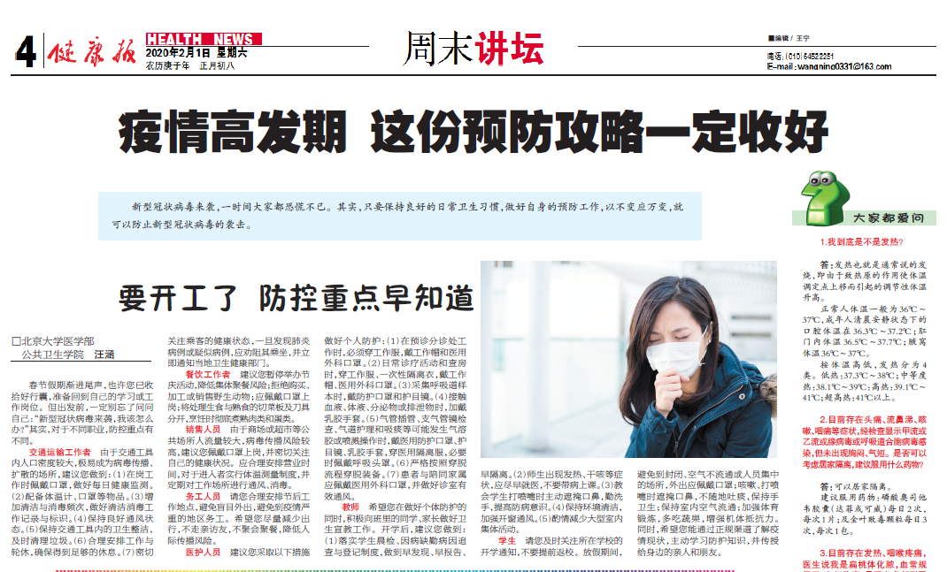 妇幼卫生学系冯强博士于2020年1月底至10月先后接受北京日报、中国体育报、人民日报、中央广播电视台总台中国之声、今日头条、抖音直播等采访,就“儿童、青少年如何居家进行体育锻炼”、“疫情当前,在家锻炼方案”、“锻炼注意事项”等问题进行解答。并撰写的科普文章“非常时期的陪玩攻略,这份室内亲子锻炼方案请收藏”,为广大家长们提供了参考意见。唐泽昱博士1月31日在yl6809永利官网党委的领导和团委的指导下,撰写一篇科普文章“看新闻,学流病-突发公共卫生事件划重点”,推送在“北大公卫人”公众号上。