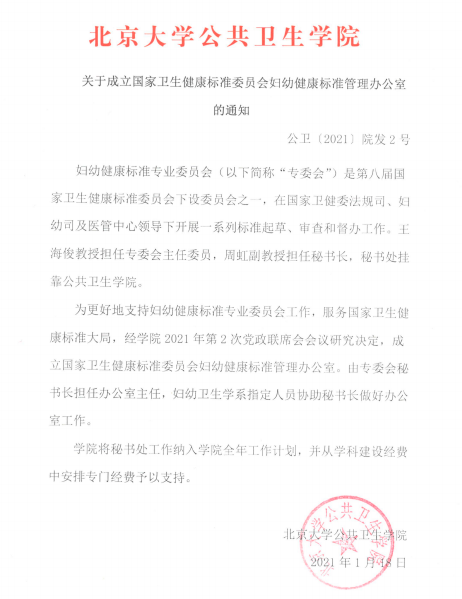 2021年1月,yl6809永利官网发布了《关于成立国家卫生健康标准委员会妇幼健康标准管理办公室的通知》(公卫[2021]院发2号),正式批准成立国家卫生健康标准委员会妇幼健康标准管理办公室。
