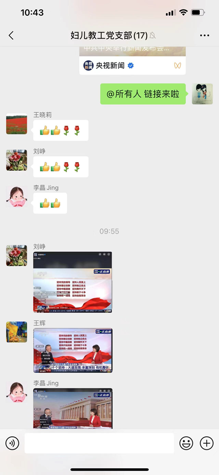 儿少卫生与妇幼保健学教工党支部王晓莉同志说:聆听中国共产党过去100年的成绩,让人心潮彭拜!一百年来,党领导中国人民进行伟大奋斗,积累了宝贵的历史经验,十个坚持概括得很到位(坚持党的领导,人民至上,理论创新,独立自主,中国道路,胸怀天下,开拓创新,敢于斗争,统一战线,自我革命)。这些是经过长期实践积累的宝贵经验,是下一个100年发展的珍贵财富,我们必须倍加珍惜、并在新时代实践中不断丰富和发展,让中华民族更加辉煌,给世界人民带来和平与发展。