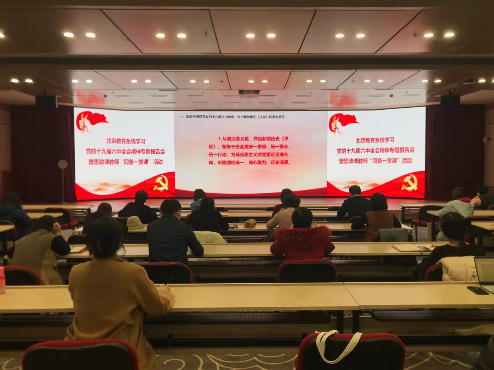 2021年11月30日,北京市委教育工委举办北京教育系统学习党的十九届六中全会精神专题报告会暨思政课教师“同备一堂课”活动。学院思政和宣传工作干部与医学部各单位同事在逸夫楼209报告厅集体听取辅导报告。