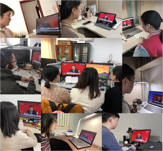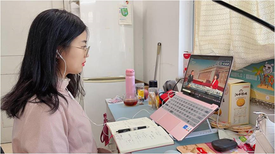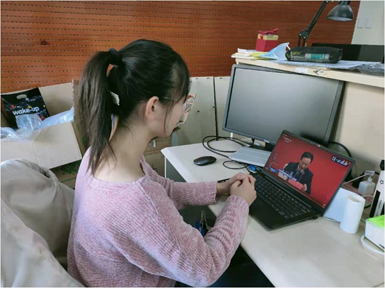 同样的场景,同时出现在学生自习室里、宿舍楼内。那些因疫情防控原因,无法聚到一处的同志们,不仅有正式党员,还有入党积极分子、共青团员和群众,他们都在自己在力所能及地利用自身条件“创造性”地收看。