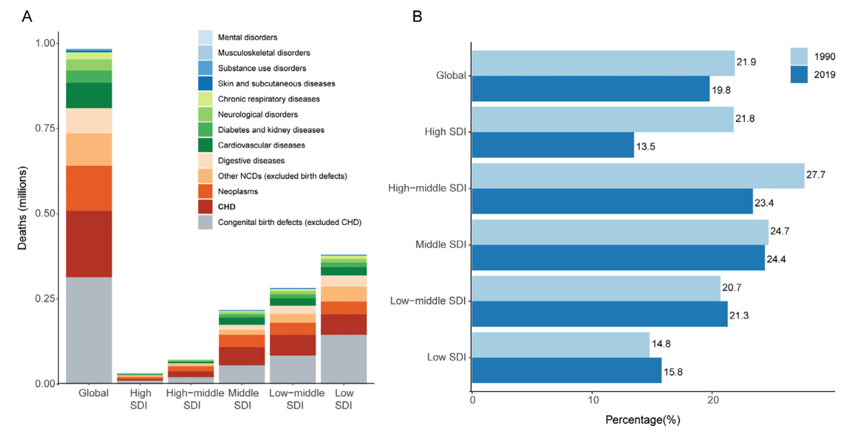 (A) 2019年20岁以下人口死于慢性非传染性疾病的人数分布。(B) 1990-2019年,20岁以下人口先心病死亡相对所有非传染性疾病死亡占比的变化。