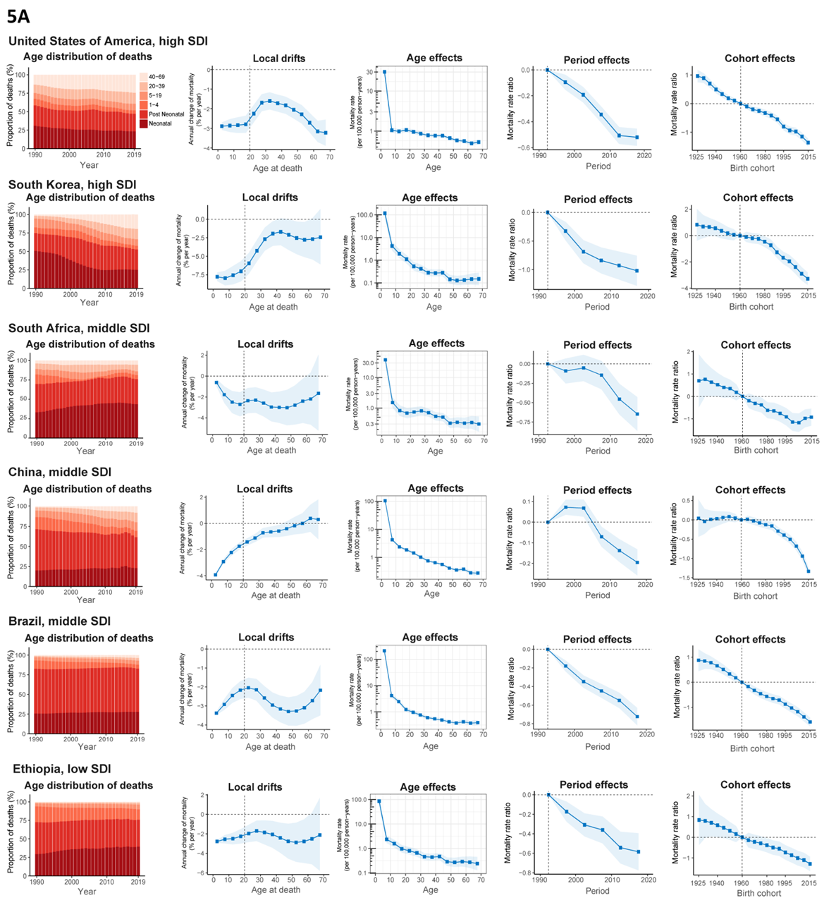 图3. 我国和世界主要国家1990-2019年先心病死亡趋势的综合对比