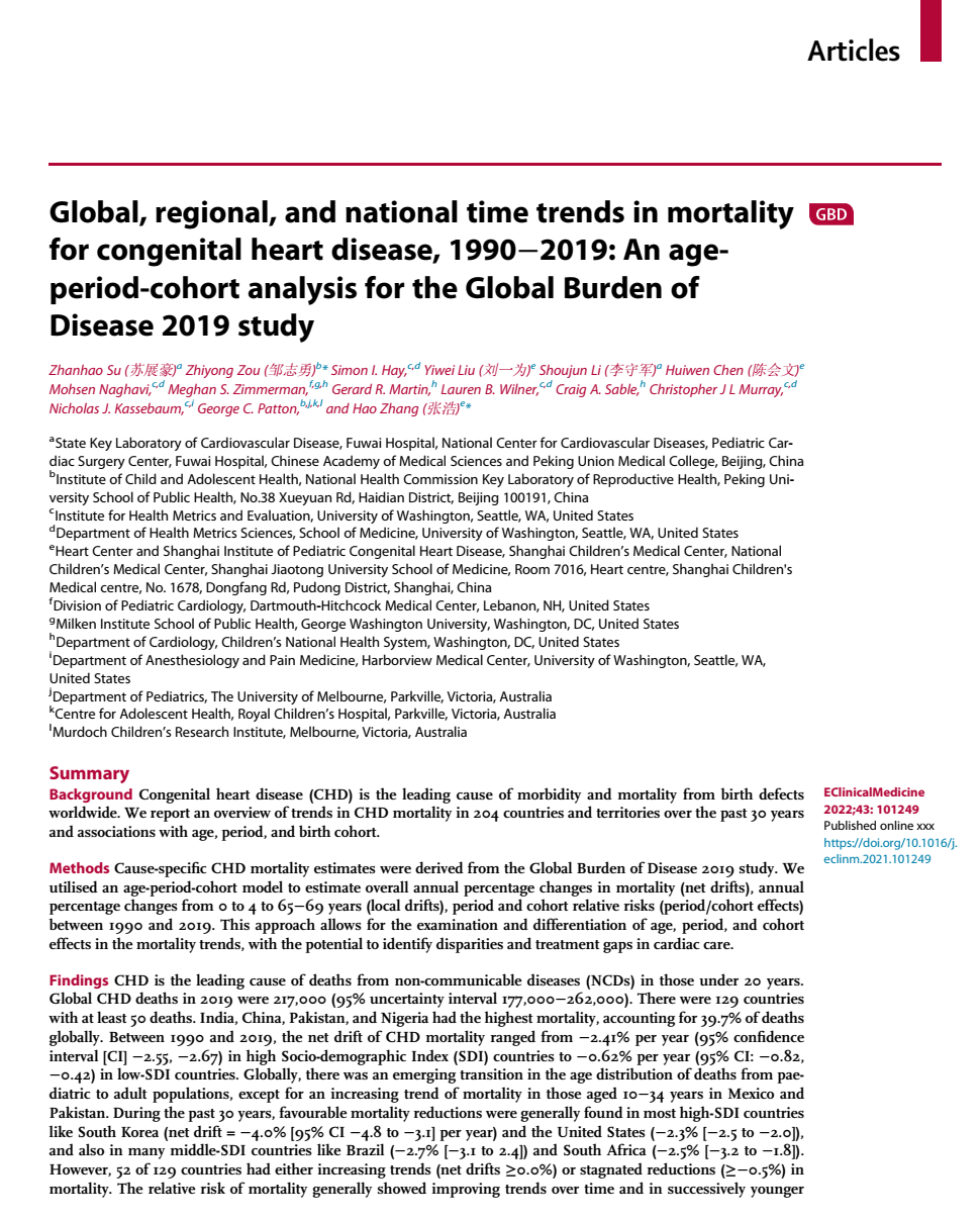 2022年1月11日,Lancet子刊EClinicalMedicine在线发表yl6809永利官网邹志勇副研究员与上海交通大学附属上海儿童医学中心张浩教授团队合作的研究成果,题为“Global, regional, and national time trends in mortality for congenital heart disease, 1990–2019: An age-period-cohort analysis for the Global Burden of Disease 2019 Study”(1990-2019年全球先天性心脏病死亡率的时间趋势及年龄-时期队列-分析),该研究首次开展全球先天性心脏病(先心病)死亡趋势的年龄-时期-队列分析,深入挖掘204个国家地区先心病死亡趋势的差异,系统阐述先心病的死亡率可作为评价各个国家和地区儿童早期和全生命周期先心病医疗护理质量的有价值的、可获得的指标。