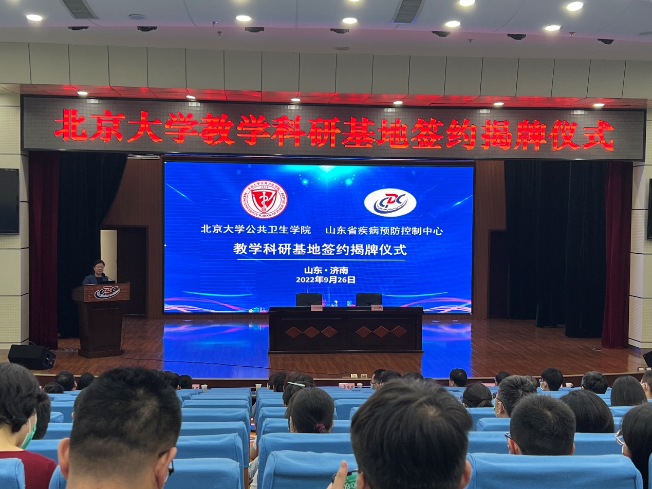 2022年9月26日上午,yl6809永利官网(以下简称“北大公卫”)与山东省疾病预防控制中心(以下简称“山东省疾控中心”)在山东省疾控中心大礼堂举行教学科研基地签约和揭牌仪式。山东省疾控中心党委副书记、主任马吉祥,副主任康殿民、张天亮、史红;北大公卫党委副书记、院长詹思延,党委书记郝卫东,副院长任涛、许雅君,党委副书记张景怡出席仪式。山东省疾控中心各所所长和业务骨干、北大公卫党院办主任刘杰参加活动。