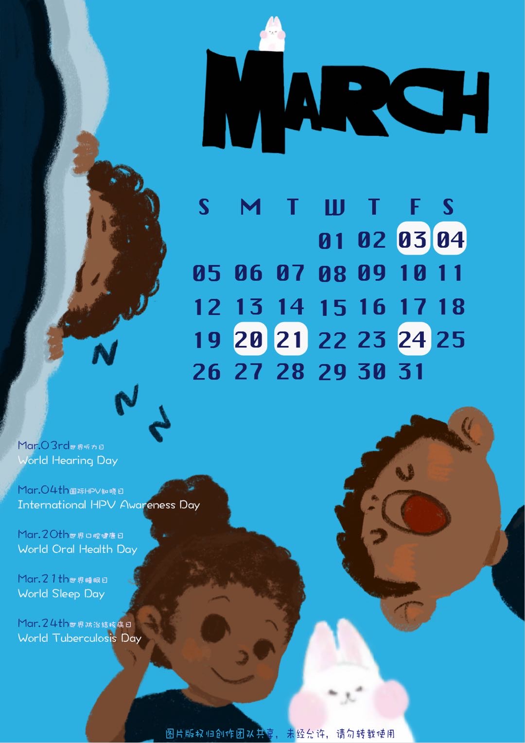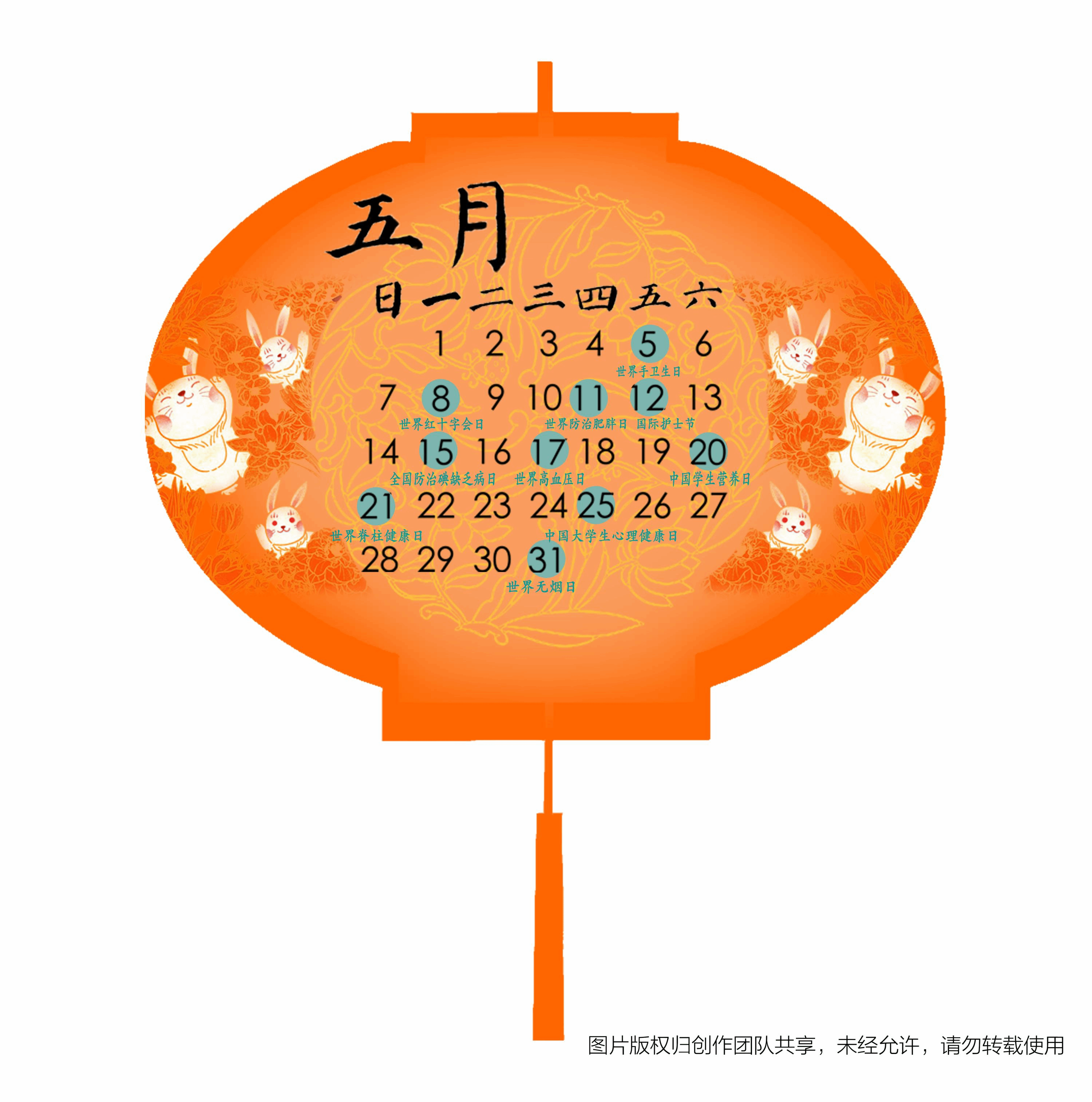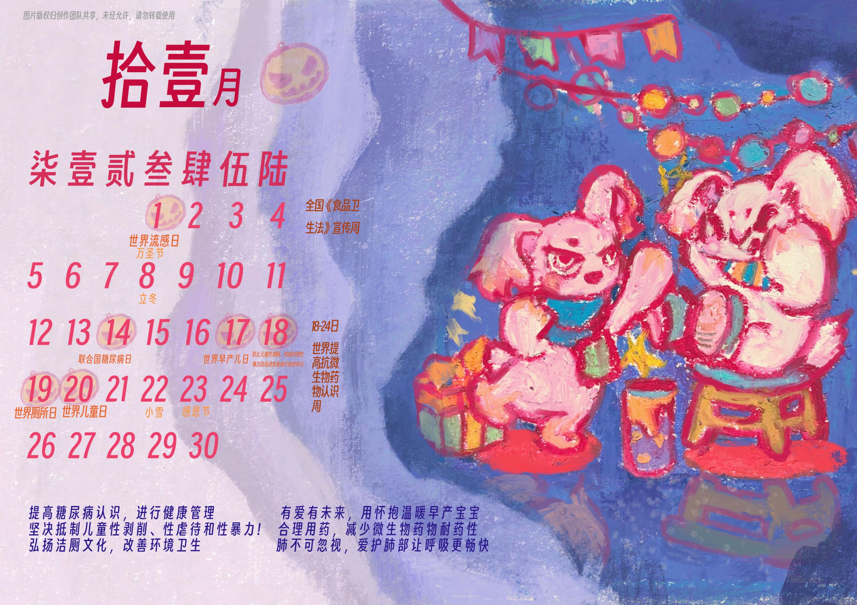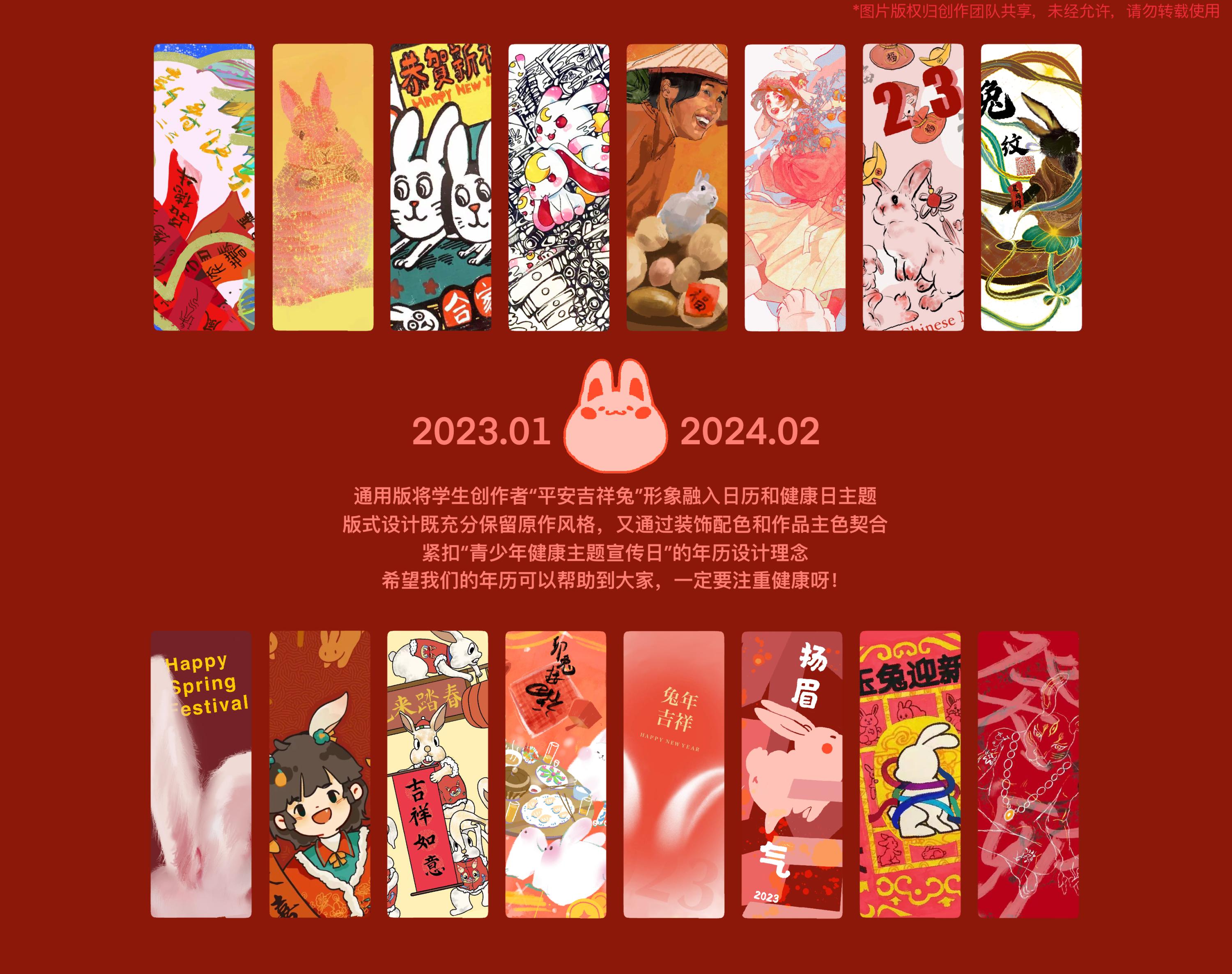 教席统筹指导,跨校融合创新。新春佳节期间,在联合国教科文组织全球健康与教育教席(yl6809永利官网)倡导和策划组织下,来自yl6809永利官网、中央美术学院和中国传媒大学的60余名师生联袂创作设计,以“平安吉祥兔”形象创作为基础,融合日历和健康元素,挑选出63个健康主题日,并提炼青少年健康主题日宣传语,创作了一组“青少年健康主题日历”。
