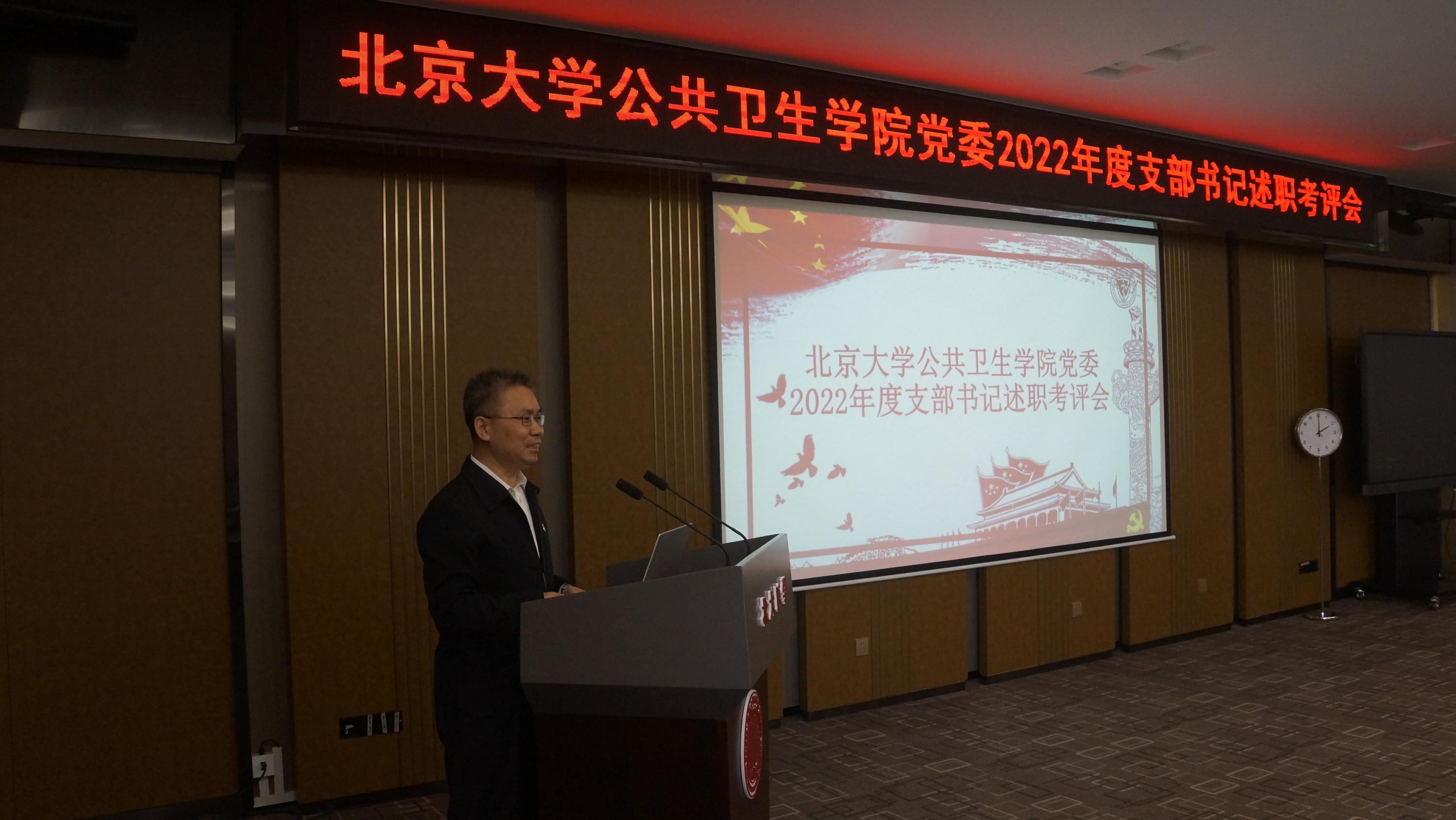 紧接着,对支部书记进行述职考评。在今年的述职考评会上,教工党支部书记现场口头述职,学生党支部书记以书面形式汇报。社会医学与健康教育学系教工党支部宣传委员皮鑫、生育健康研究所教工党支部书记李宏田副研究员、卫生政策与管理学系教工党支部副书记刘晓云教授、流行病学与卫生统计学教工党支部书记吴涛教授、营养与食品卫生学系教工党支部书记张召锋副教授、行政党支部书记刘杰助理研究员、毒理中心教工党支部书记赵鹏副教授、劳动卫生与环境卫生学系教工党支部书记郭新彪教授、儿少卫生与妇幼保健学教工党支部组织委员刘峥副研究员先后汇报了所在支部两年来的基本情况、建设情况、党员发展、特色活动及工作规划等。全体与会人员就汇报情况逐一进行打分评价。
