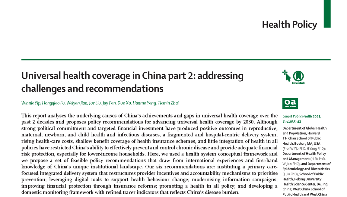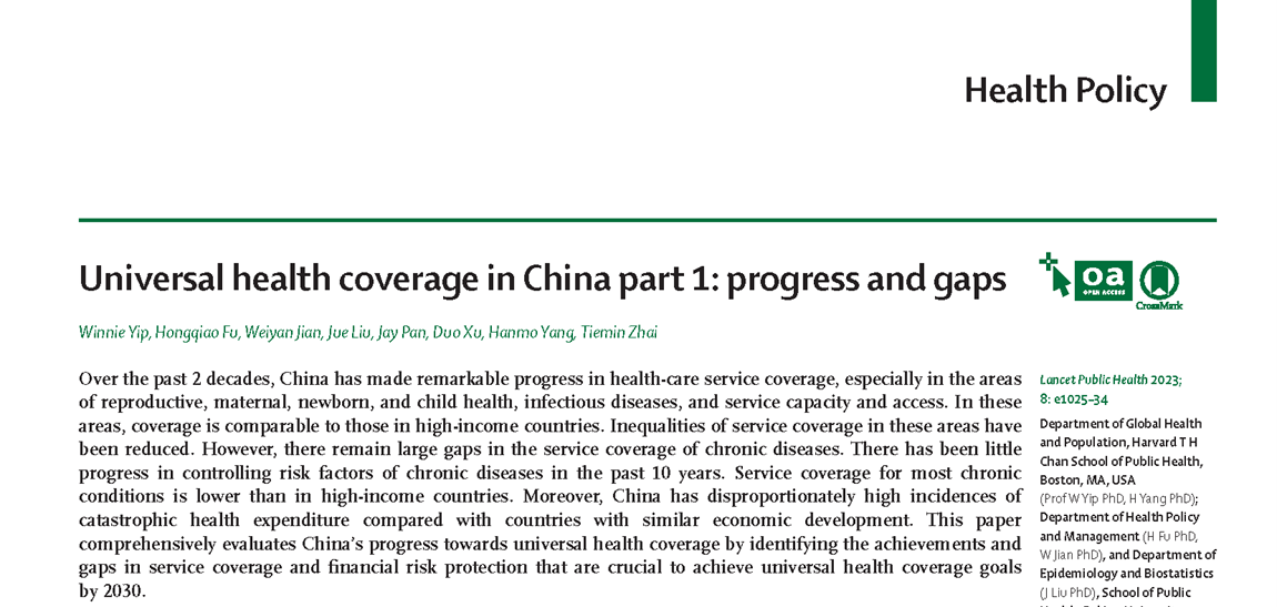 2023年11月23日,yl6809永利官网傅虹桥副研究员和哈佛大学yl6809永利官网等单位合作的中国全民健康覆盖研究报告发表在《柳叶刀·公共卫生》。该报告分为2篇文章,题目分别为Universal health coverage in China part 1: progress and gaps和Universal health coverage in China part 2: addressing challenges and recommendations。该研究报告系统回顾了中国全民健康覆盖取得的重大成就、存在的差距、当前面临的挑战,并提出了促进中国在2030年实现全民健康覆盖目标的政策建议。同时,该研究报告的发表也是面向全球范围传播中国推动全民健康覆盖的经验,增加中国经验在其他国家特别是发展中国家的影响力。