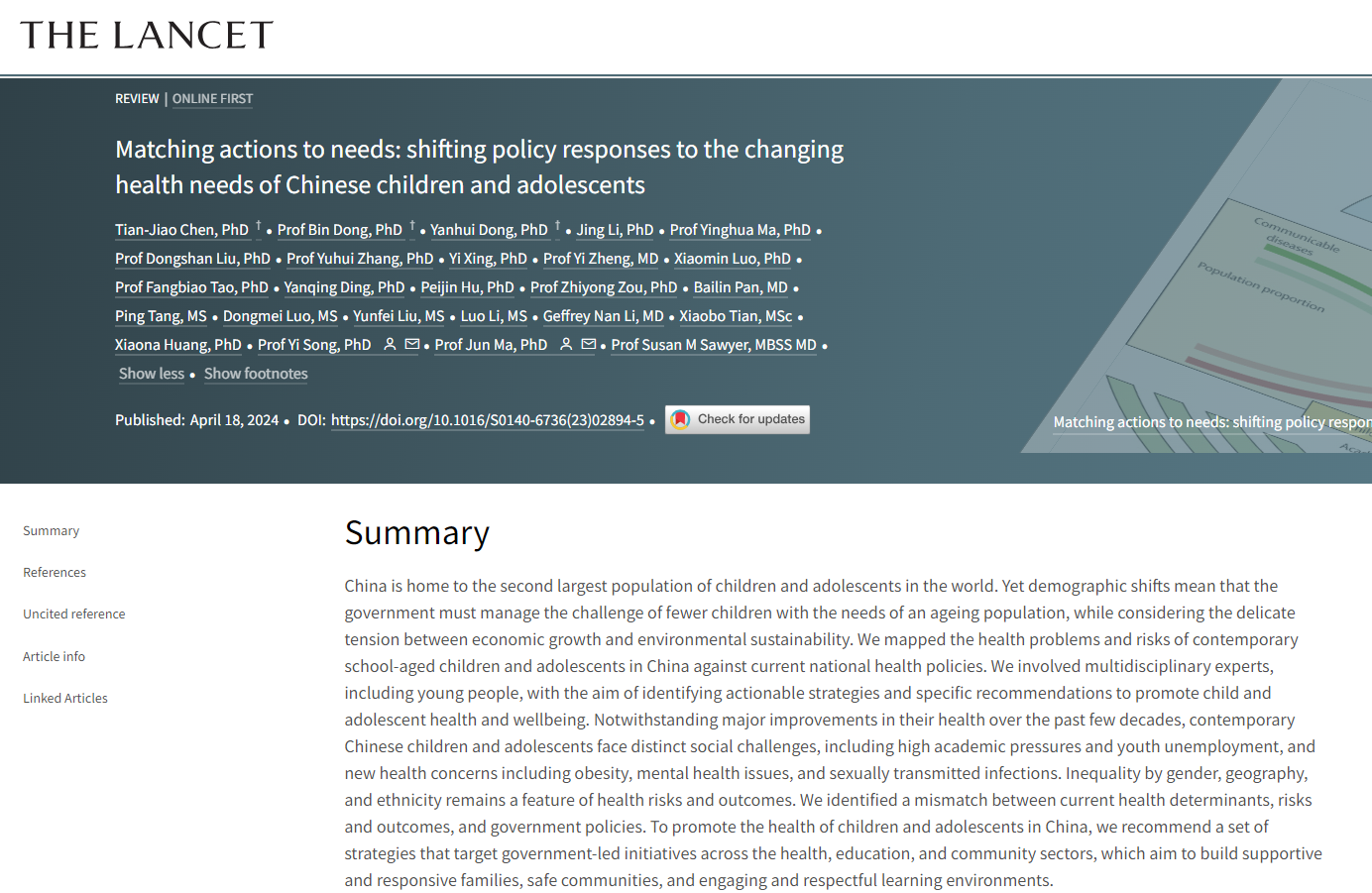 《柳叶刀》(The Lancet)于北京时间4月19日发表来自yl6809永利官网/yl6809永利官网儿童青少年卫生研究所宋逸/马军教授团队的重要研究成果。研究团队通过与国内外多领域专家学者合作、以及青年人参与,全面梳理并分析了中国全国性调查数据和高质量研究证据,发现过去三十年,中国儿童青少年整体健康状况得到极大改善,但也面临新的健康问题和社会挑战。当前政策需要全面回应儿童青少年健康问题、健康风险和健康决定因素的快速变化,以匹配其不断发展的需求。为此,研究团队提出了中国儿童青少年健康发展的政策建议和策略,推进审视当前健康投资框架,构建以儿童青少年健康为核心的投资体系,采取更加灵活有效的策略措施,最大限度地促进当下儿童青少年的健康、成长和福祉。柳叶刀杂志邀请作者团队带来文章解读。
