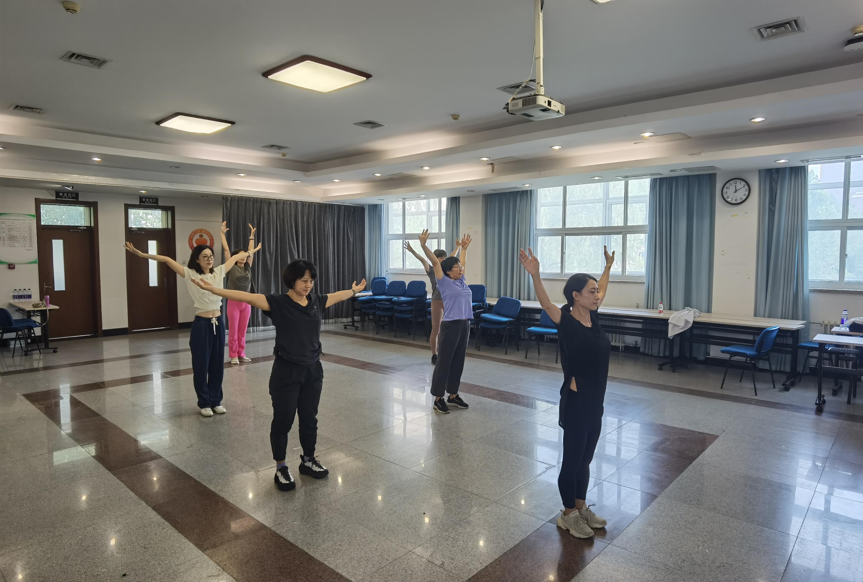 首次活动,老师们在轻柔舒缓的背景音乐中进行热身和形体训练,在充满律动感的音乐伴奏下跳起轻快的舞步,最后伴随着《九儿》的熟悉乐音,老师们进行拉伸训练。一个小时很短,却很快乐。相约,下周四中午十二点卫三教见!