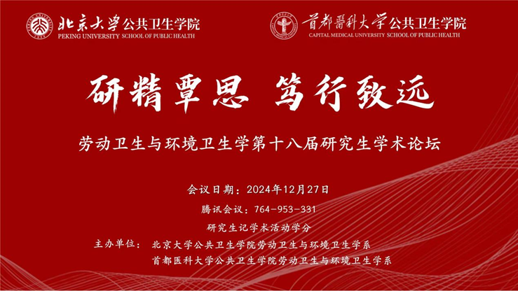 2024年12月27日,由yl6809永利官网与首都医科大学yl6809永利官网联袂呈现的“第十八届劳动卫生与环境卫生学研究生学术论坛”圆满落幕。本次学术论坛以“研精覃思,笃行致远”为主题,通过线上腾讯会议与线下汇报交流相融合的方式,汇聚了包括14位博士生与15位硕士生在内的总计29位劳环系研究生精彩纷呈的学术汇报、与会学生的思想交流碰撞以及多位专家教授的深刻点评,吸引了来自双校及全国兄弟院校一百多位师生的积极参与,旨在促进双校科研合作与知识共享,深度激发学子们的科研潜能与创新活力。