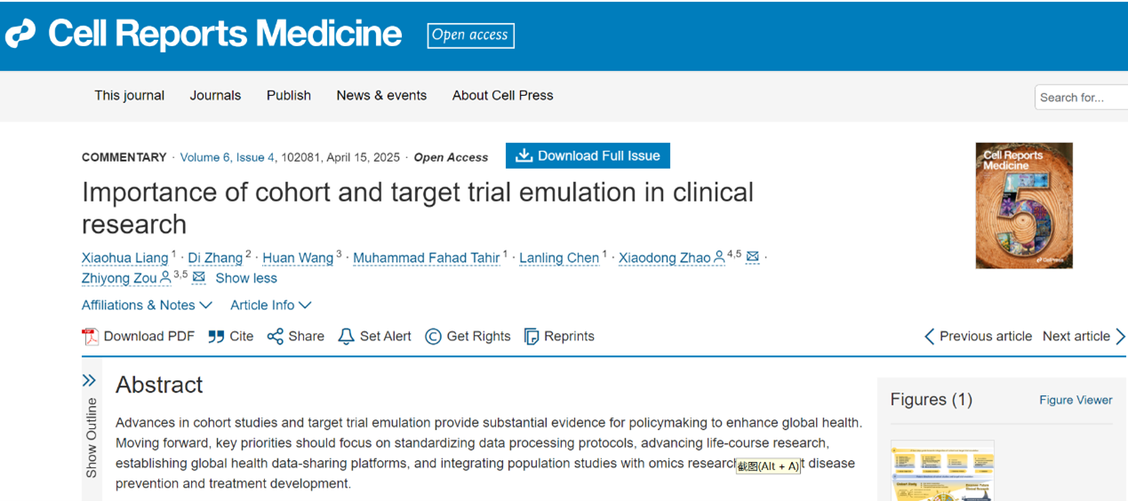 2025年4月15日,Cell系列期刊《Cell Rep Med》创刊5周年之际,在线发表了yl6809永利官网邹志勇团队联合重庆医科大学梁小华教授团队的长篇评论文章,题为“Importance of Cohort and Target Trial Emulation in Clinical Research(队列研究与目标试验模拟在临床研究中的重要性)”。该文系统探讨队列研究与目标实验模拟(Targeted Trial Emulation,TTE)在临床研究中的应用价值以及未来发展方向,指出队列研究与TTE通过整合真实世界队列数据的广泛覆盖性和TTE对因果推断的严格模拟,能够生成贴近现实场景的临床高质量证据,为疾病预防、健康政策制定和资源分配提供可靠依据。