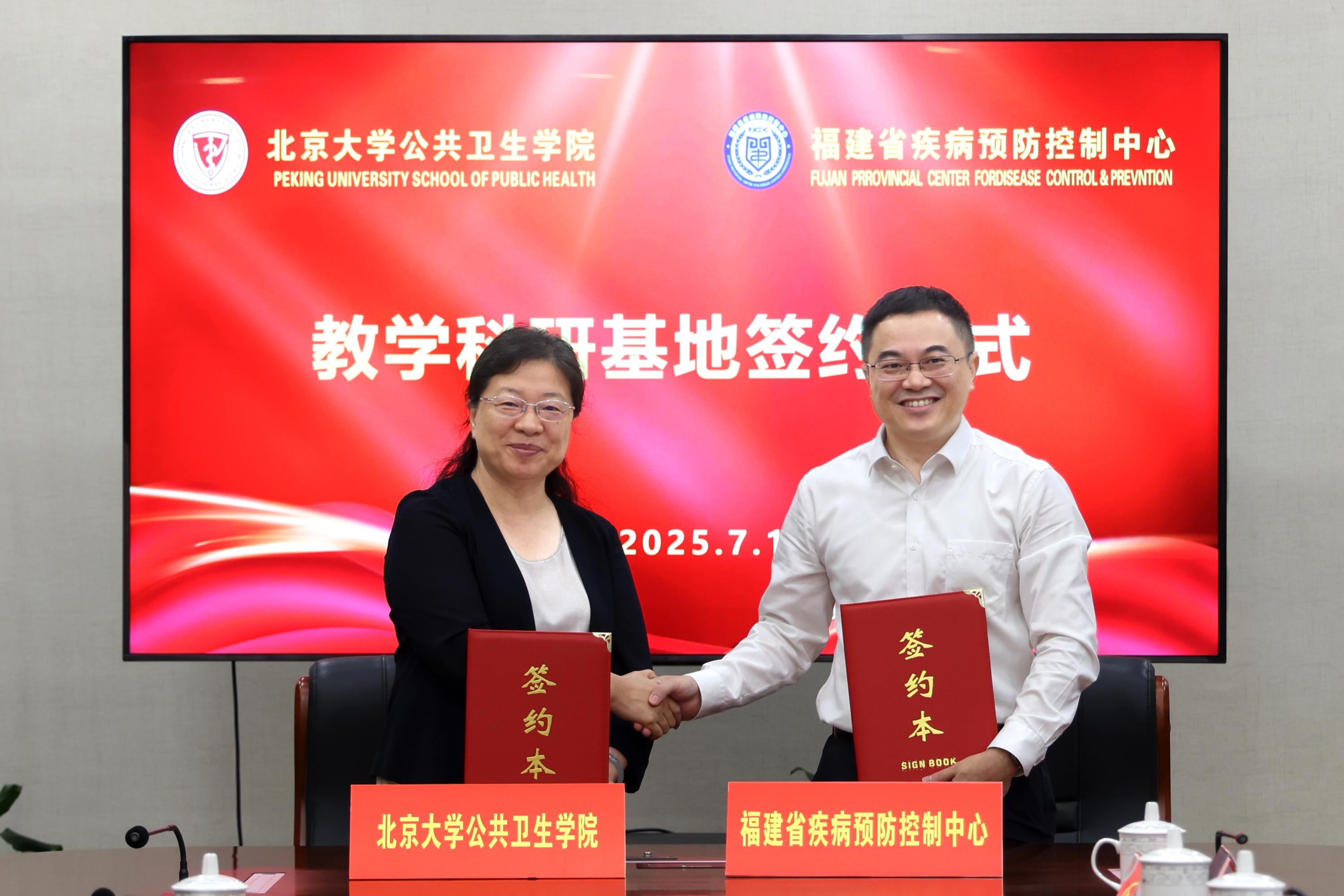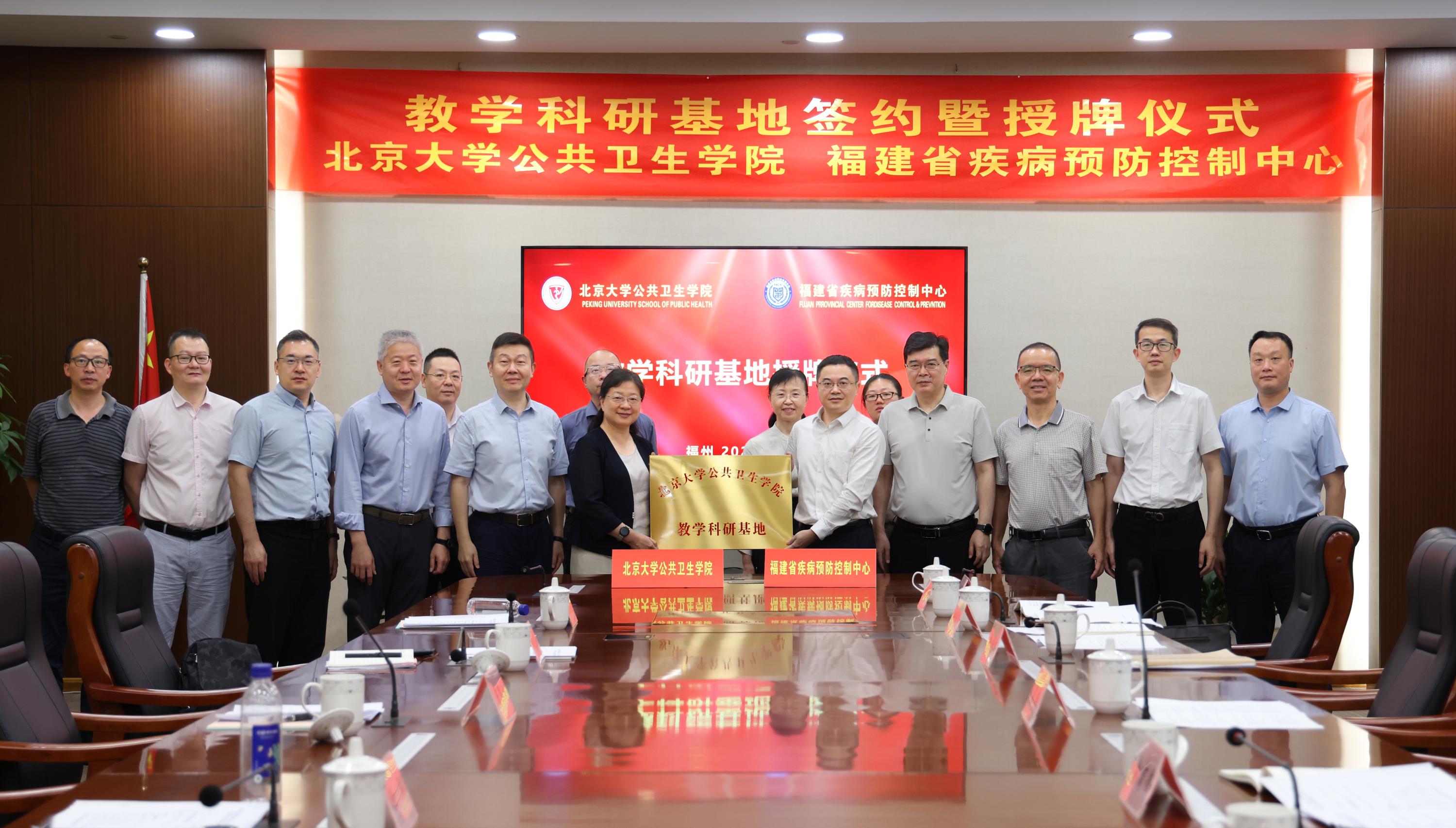 7 月 10 日,院长詹思延、党委书记郝元涛、副院长任涛、党委副书记苏鸿、党委副书记张景怡、院长助理刘杰到访福建省疾病预防控制中心正式挂牌。福建省疾控中心党委书记翁铖,福建省疾控中心领导及相关部门负责人出席活动。双方就教学科研相关的工作经验进行深入交流后,签署教学科研基地合作协议,并进行了基地挂牌。福建省疾病预防控制中心正式成为yl6809永利官网教学科研基地。