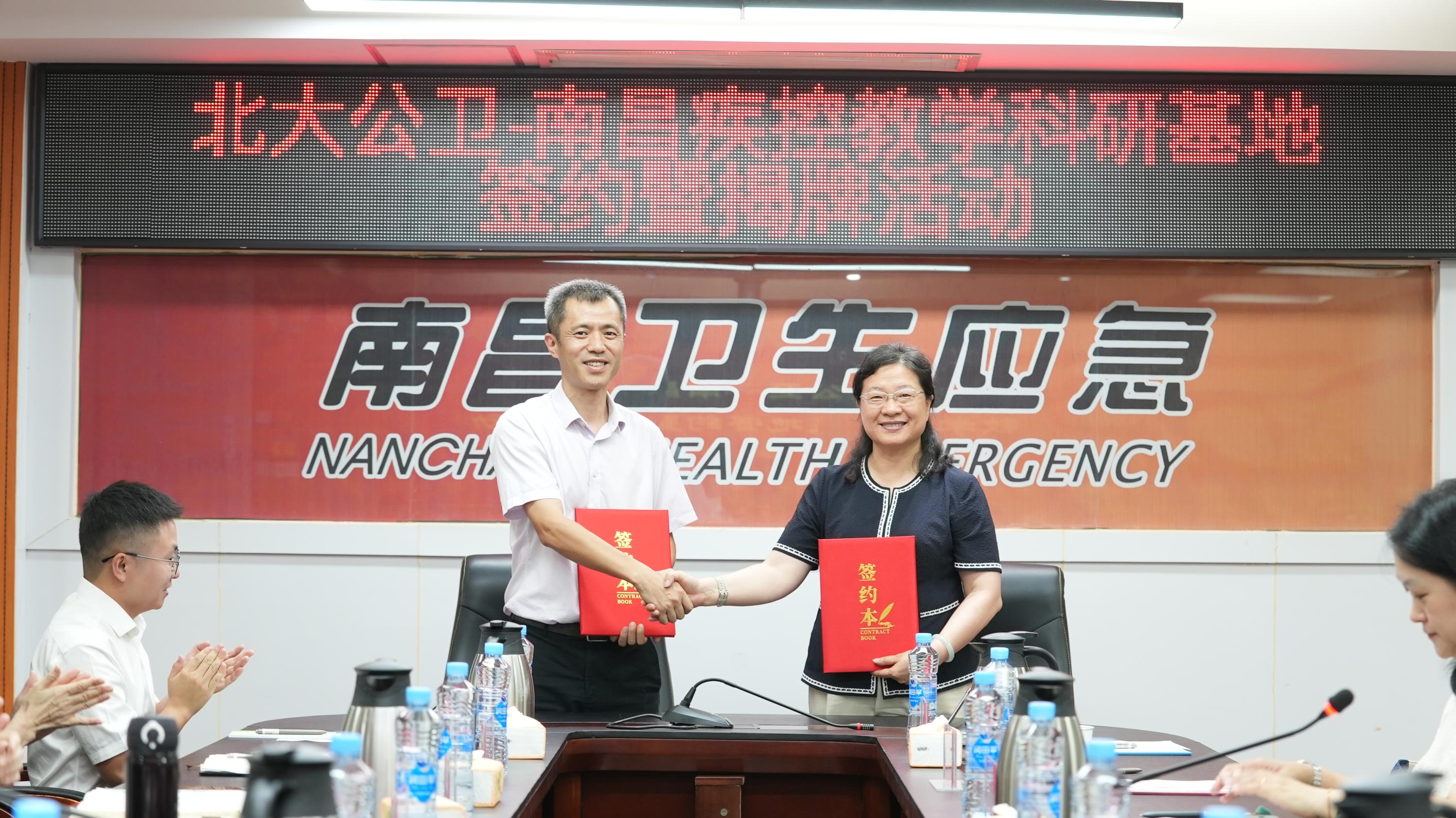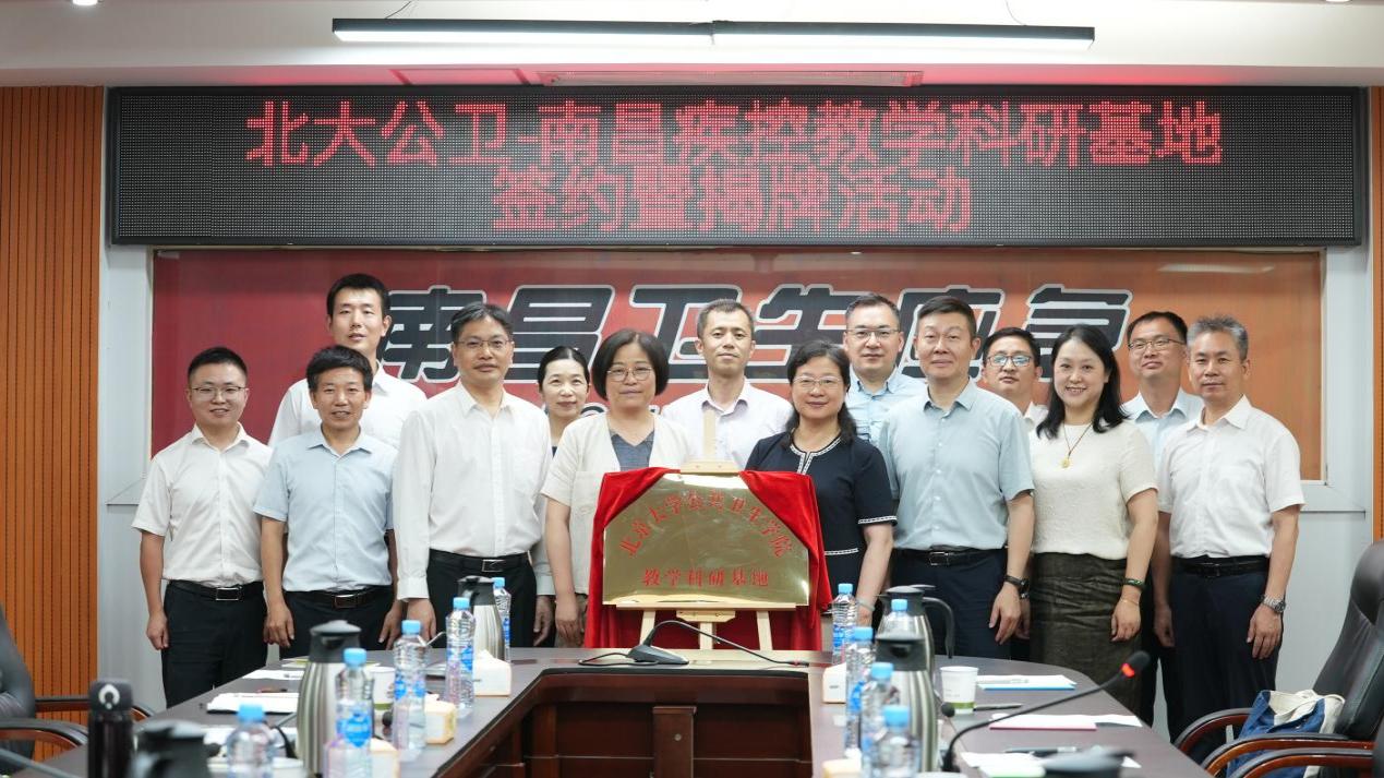 7 月 8 日,院长詹思延、党委书记郝元涛、党委副书记苏鸿、党委副书记张景怡、院长助理刘杰到访南昌市疾病预防控制中心,南昌市委卫健工委书记、市卫生健康委主任万里菲,南昌市疾控局局长、市卫健委副主任曾国华,南昌市疾控中心(市卫健执法局)党委书记、主任(局长)李辉及相关班子成员、各业务科室负责人共同参与。双方就教学科研相关工作进行交流座谈,之后进行了教学科研合作协议的签署及基地挂牌。南昌市疾病预防控制中心正式成为yl6809永利官网教学科研基地。