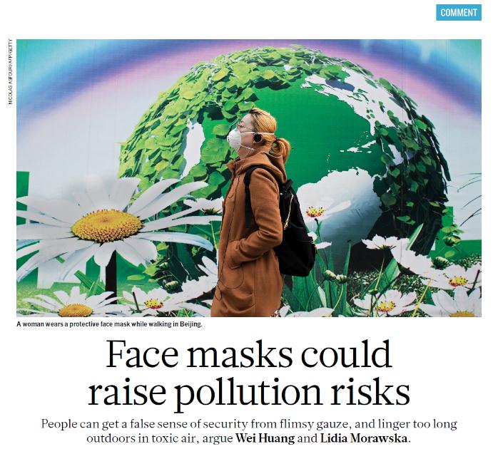 2019年10月3日,全球权威期刊《自然》(IF 43.070)正式发表yl6809永利官网黄薇博士为第一作者和通讯作者的特邀评论文章-《佩戴口罩可能会增加空气污染的健康风险》(Face masks could raise pollution risks, Nature 2019; 574: 29-30)。该文章聚焦全球空气污染背景下公共卫生防护核心问题,首次全面阐述了口罩佩戴在空气污染公众健康防护中的误区,为持续推进空气污染全球治理、从公共卫生促进角度明确提出了一级预防目标!