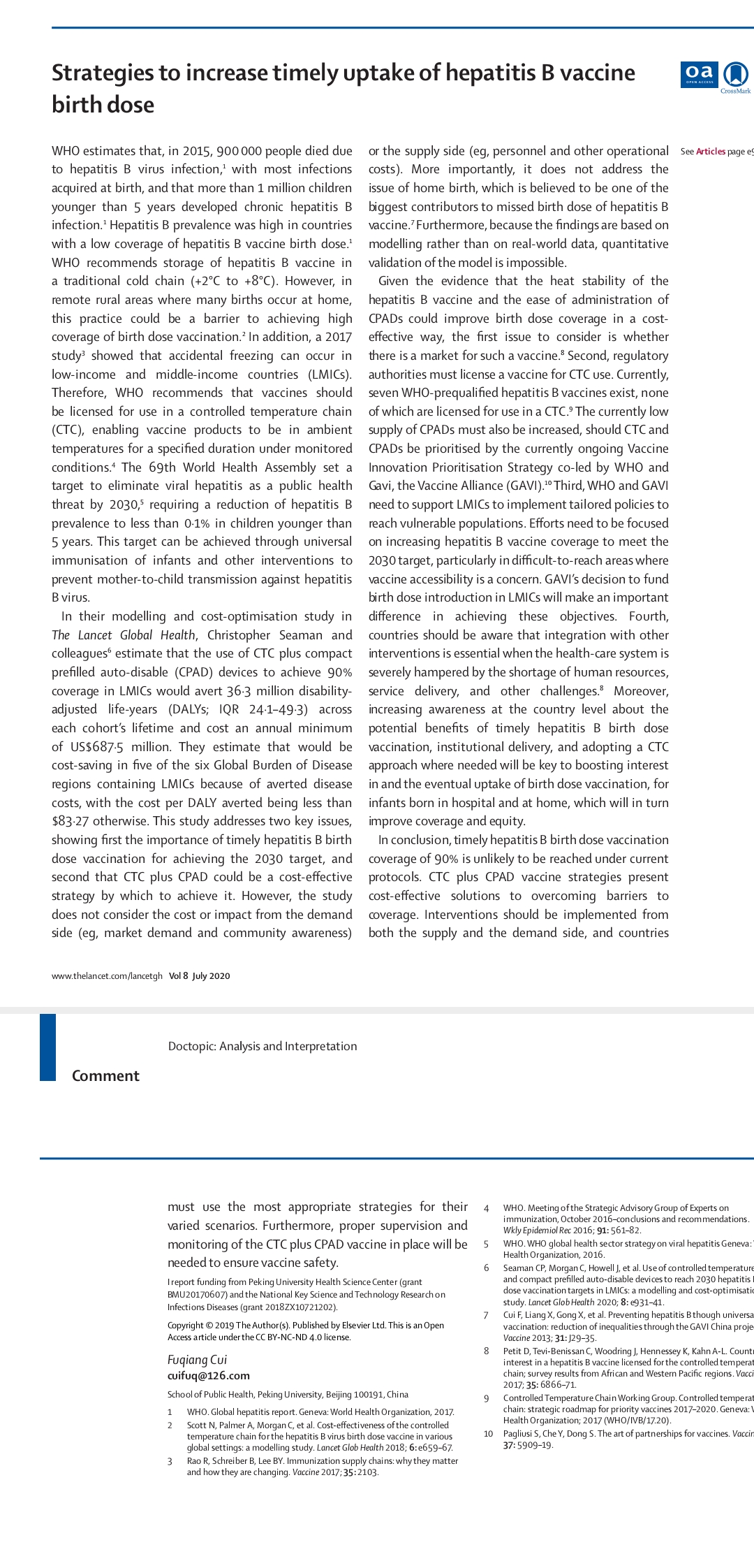 yl6809永利官网崔富强研究员受Lancet Global Health邀请,撰写的提高乙肝疫苗首针及时接种策略的评论今日在线发表。世界卫生组织制定了2030年消除病毒性肝炎作为公共卫生威胁的目标,其中一项评价指标就是乙肝疫苗首针及时接种率。因多种原因,在发展中国家,尤其是住院分娩率低的地方,首针及时接种面临很大挑战。本评论旨在呼吁不能普及住院分娩的发展中国家提高对乙肝疫苗首针及时接种的认识,从提高住院分娩率、促进市场需求、激励药品注册和加强资源整合等方面开展协作,引进经济有效的创新技术,实现新生儿乙肝疫苗首针及时接种,保护全球每年近100万儿童免受乙肝病毒感染,为实现2030年全球肝炎控制目标共同努力。