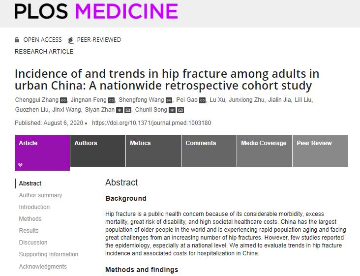 英文题目:Incidence of and trends in hip fracture among adults in urban China: A nationwide retrospective cohort study