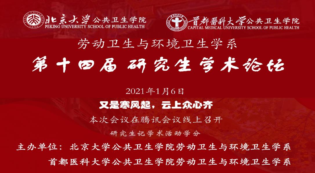 为促进研究生学术交流培养学生良好的科研素质和提升学生的综合能力,2021年1月6日上午8时30分,第十四届yl6809永利官网与首都医科大学yl6809永利官网劳动卫生与环境卫生学系研究生学术论坛拉开序幕。自2007年第一届劳环系研究生论坛举办以迄今为止,已连续成功举办了十四届。虽然近日寒潮和疫情形势仍然紧张,但在会务组及各位老师和同学们的齐心协力下,本次论坛以腾讯会议的形式安全、有序、热烈生动地展开,线上学术气氛依旧浓厚。来自北医和首医劳环系的老师和研究生们约80余人参加了本次论坛。论坛开场由四位研究生同学作为主持人开场,同学们热情洋溢的开场语极大地活跃了本次论坛的氛围,由邓芙蓉老师介绍参会的嘉宾,我系郭新彪老师和首医田琳老师致辞,激励同学们在学业上精益求精,以本次论坛为契机互相取长补短,不断追求学术进步。