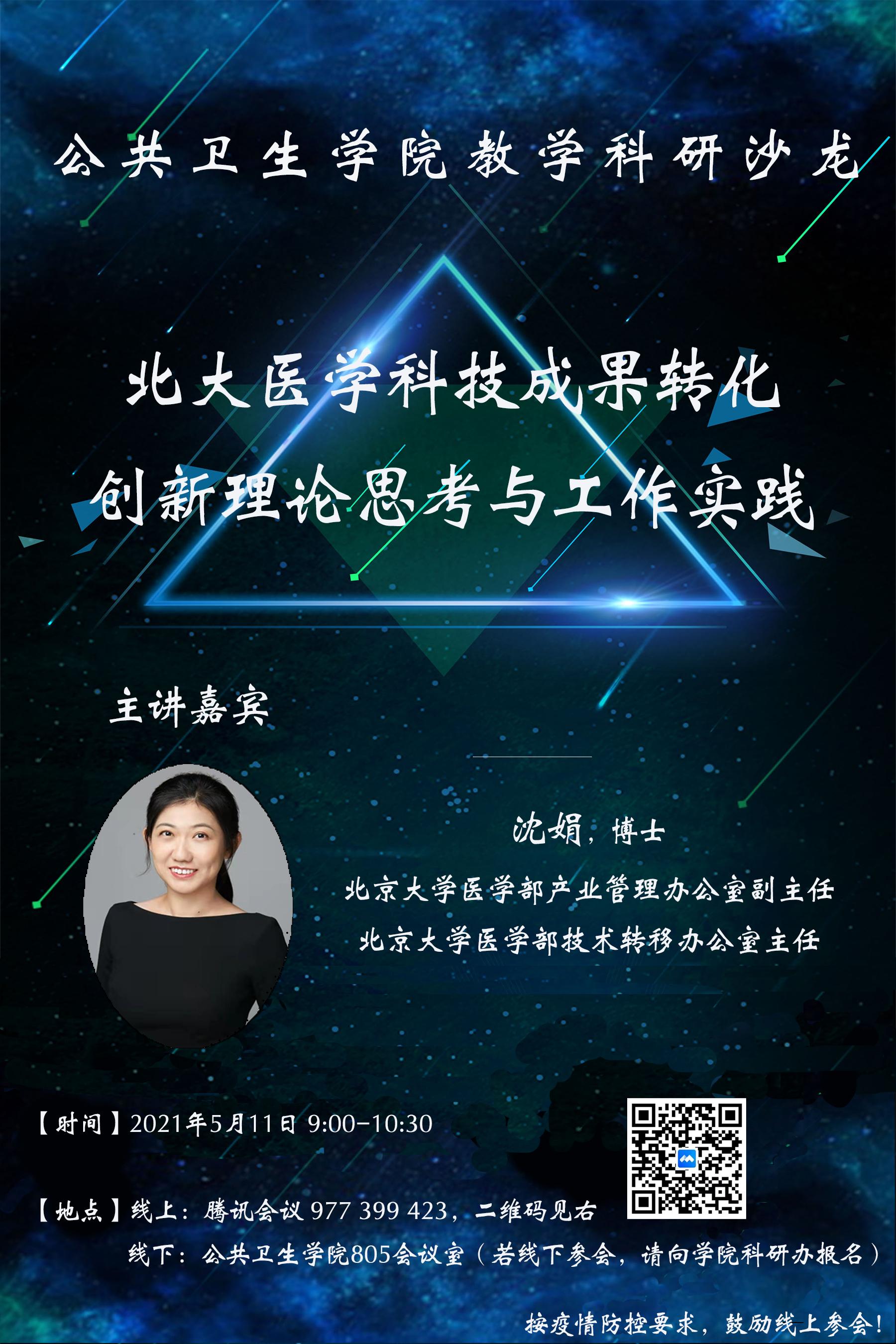 沙龙于2021年5月11日上午9点在公卫学院805会议室举行,为方便老师们参会,以腾讯会议方式线上线下同时进行,使更多老师有机会学习。本次沙龙特别邀请了医学部产业管理办公室副主任、技术转移办公室主任、北大医学科创中心运行理事会秘书长沈娟博士,为学院教师做题为“北大医学科技成果转化创新理论思考与工作实践”的报告。沈娟博士2012年毕业于yl6809永利官网,目前负责医学部技术转让、校企横向科研、知识产权管理及产学研合作等相关工作,在科技成果转化方面具有丰富的工作经验。来自学院十二个系、所、中心的二十多名教学、科研人员以及感兴趣的研究生们参加了活动。