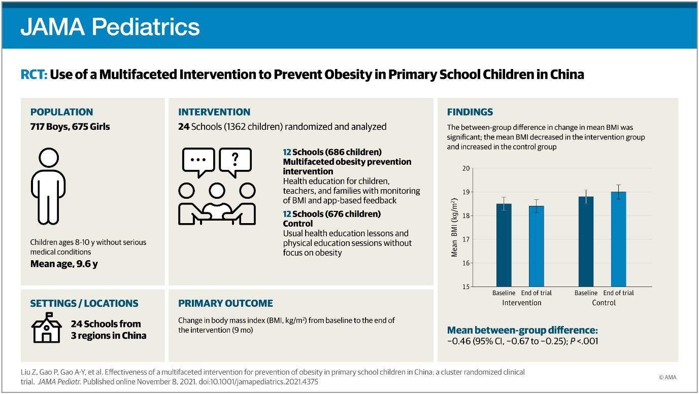 这是一项设计严谨的干预研究,在我国东部(北京)、中部(山西长治)和西部(新疆乌鲁木齐)纳入24所小学1392名四年级儿童。12所小学被随机分配至干预组,12所小学被随机分配至对照组。基于社会生态模型研发综合干预技术包,不仅改善儿童肥胖相关的饮食运动行为,而且动员家庭和学校帮助儿童改进行为,采用移动健康技术监测儿童的饮食运动行为和体重指数(BMI)并给予反馈指导。干预一个学年后,干预组BMI从18.5 kg/m2下降至18.4 kg/m2,对照组BMI从18.8 kg/m2升至19.0 kg/m2;相比于对照组,干预组BMI平均下降0.46 kg/m2(95% CI: -0.67, -0.25);干预组儿童肥胖率下降27.0%,明显高于对照组(5.6%);超重肥胖儿童的干预效果高于体重正常儿童。在不同地区、性别、母亲教育水平、主要照顾者类型的干预效果相似。