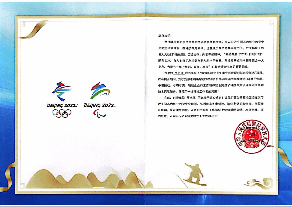 继国际冬奥组委会感谢信后,近国家科技部科技冬奥领导小组又发来感谢信,对yl6809永利官网公卫学院团队在北京冬奥会新冠疫情监测和防控中的科研工作再次表示感谢,并肯定了贾忠伟教授团队的冬奥科研成果。