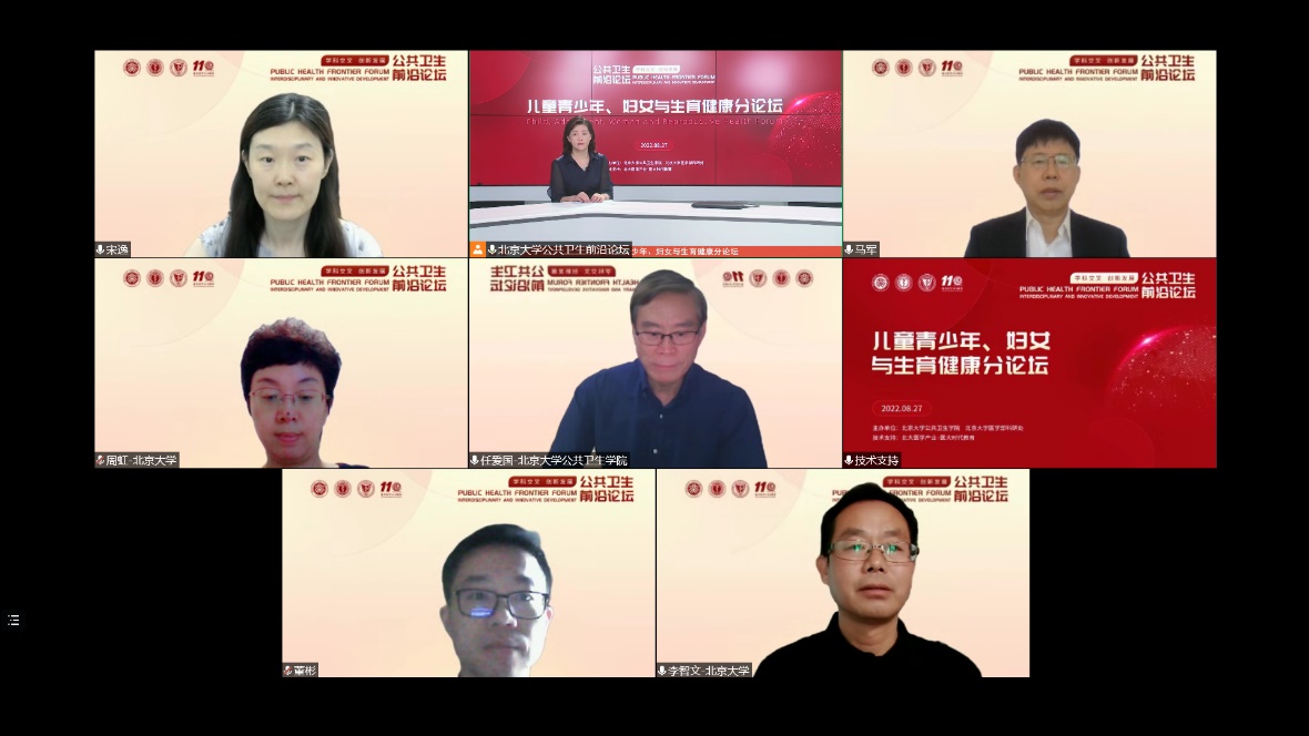 2022年正值北大医学办学110周年,yl6809永利官网联合yl6809永利官网医学部科研处于8月26~27日共同举办了《“学科交叉,创新发展”公共卫生前沿论坛 》,旨在加强学术交流、促进公共卫生发展。作为公共卫生前沿论坛的重要部分,“儿童青少年、妇女与生育健康分论坛”于2022年8月27日(周六)8:30-17:30以线上和线下相结合的方式召开。本次分论坛的主题是“新时期儿童青少年、妇女与生育健康热点问题”,目的是邀请国内外相关领域专家学者围绕新时期国内外儿童青少年、妇女与生育健康领域面临的热点和前言问题进行广泛交流,促进yl6809永利官网儿少、妇幼与生育健康学科群建设,也为兄弟院校相关专业学科群的发展提供借鉴。分论坛分上、下午两个模块,上午是国内外资深专家专场,下午是青年学者专场。共邀请了18位国内外相关领域嘉宾进行了演讲,邀请了6位资深专家进点评。