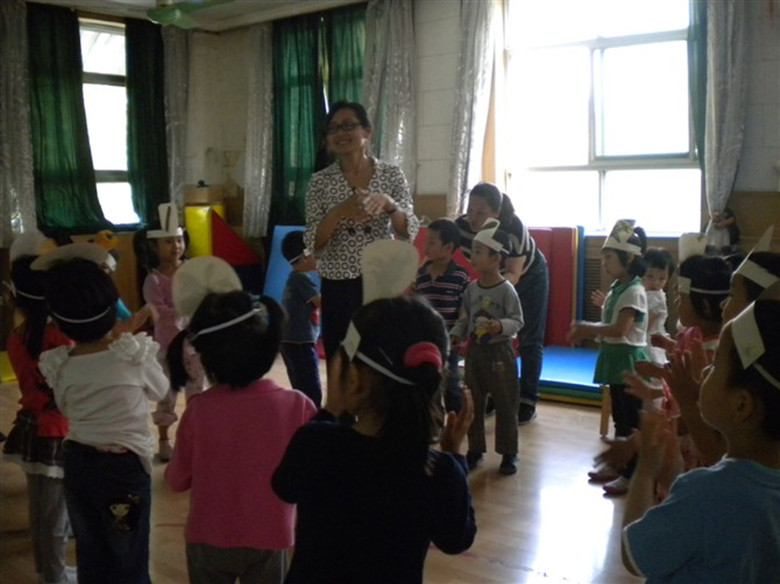 图为许雅君老师代领北医幼儿园小朋友们做游戏