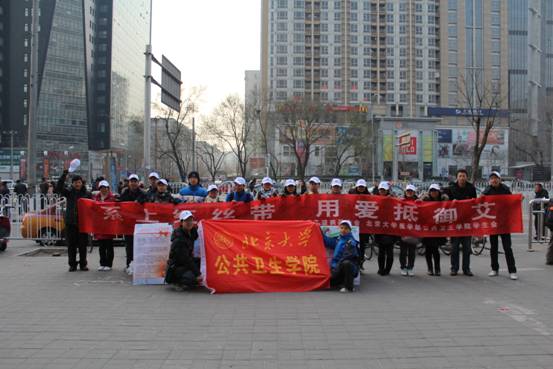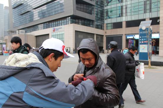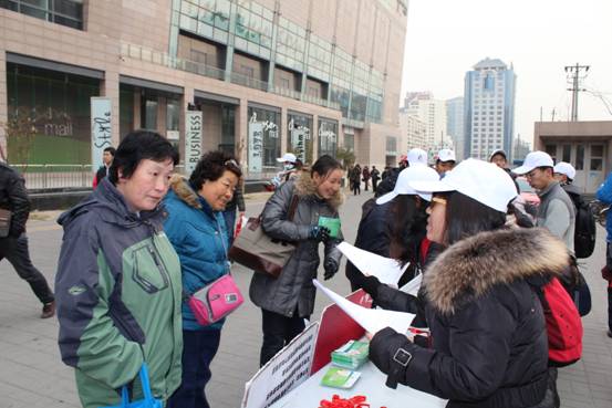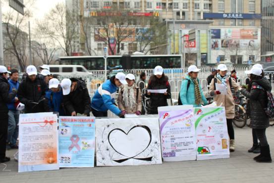 经过一个多月紧张而又周密的准备,同学们八点就顶着寒风来到了东直门交通枢纽。在进行了简单的物资准备、场地布置和人员分配之后,活动开始。活动现场布置分宣传展板区、横幅签名区、爱心寄语区、防艾知识有奖问答区。首先由七名同学在场地四周发放宣传资料,为过往行人佩戴红丝带,并引导行人前往展位桌前参加各项活动。宣传展板区重点介绍了艾滋病的传播途径、预防措施、国家相关政策及消除艾滋病歧视的倡议内容等,吸引行人驻足观看;在横幅签名区,公众纷纷在横幅上签名,表达自己对预防艾滋病活动的支持,长约八米的横幅上密密麻麻地签满了名字;爱心寄语区,路人在便利贴上写下对艾滋病患者的祝福,在展板上拼出了一个巨大的心形,表达对艾滋病疾病现状的关注及对艾滋病患者、艾滋病病毒携带者的关爱;防艾知识有奖问答区,通过一系列有趣的防艾基本知识问答,加深了公众对预防艾滋病相关知识的了解,一些参与者还在互动过程中提出了自己对防艾工作的见解。