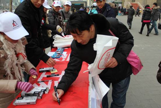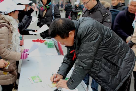 尽管活动现场寒风凛冽,但参与活动的公众依旧热情高涨,在三个半小时的活动中,近一千名群众参与其中,他们佩戴着红丝带穿行在不同活动区域,在获取防艾知识的前提下,以“零歧视”的态度,以爱心寄语、横幅签名的实际行动表达对艾滋病患者的关怀和支持。