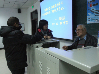 在讲座的最后,陈老师把自己总结的一句话送给我们:“科学研究,贵在提出疑问,贵在亲自动手,不能人云亦云。”他用这句话勉励我们在科研路上要有质疑与动手能力,获得了在场观众的热烈掌声。面对热情的同学们,陈老师风趣地说:“你们有什么问题想问可以打我家的电话,我随时都欢迎。”这样一位随和的老者,即使已退休多年,仍关心着祖国青年人才的培养,不禁让人肃然起敬。