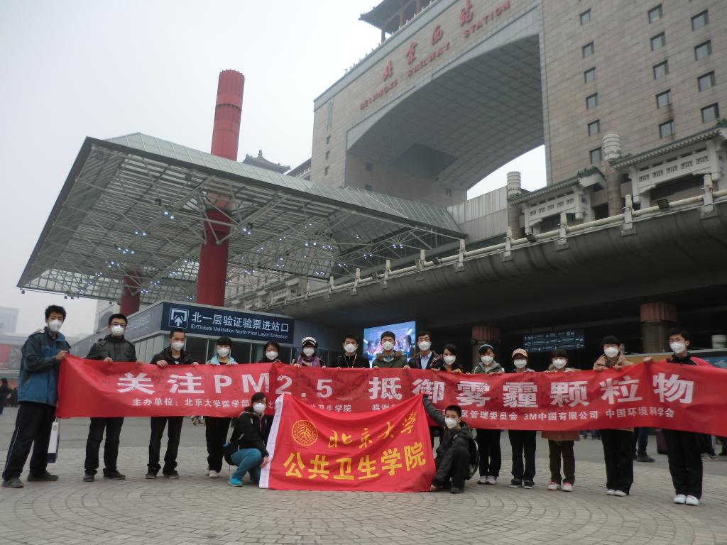 以“关注PM2.5 抵御雾霾颗粒物”为主题的北京西站宣传活动于3月31日上午顺利开展。宣传展板区、横幅签名区、PM2.5 有奖知识问答区和N90型口罩佩带方法普及区吸引了不少旅客和行人驻足观看。3M中国有限公司某工程师亲临现场指导过往行人正确佩戴N90型口罩。此次活动,不仅是大家巩固PM2.5基本知识,学习雾霾天气自我防护措施的机会,同时也是公卫学子走进社会服务社会的一个契机。