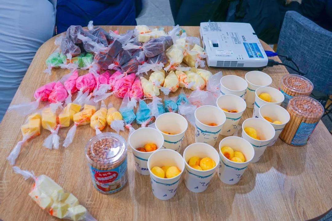 分装好各种颜色和口味的巧克力,将制作巧克力的食材整齐的摆放在活动桌前。