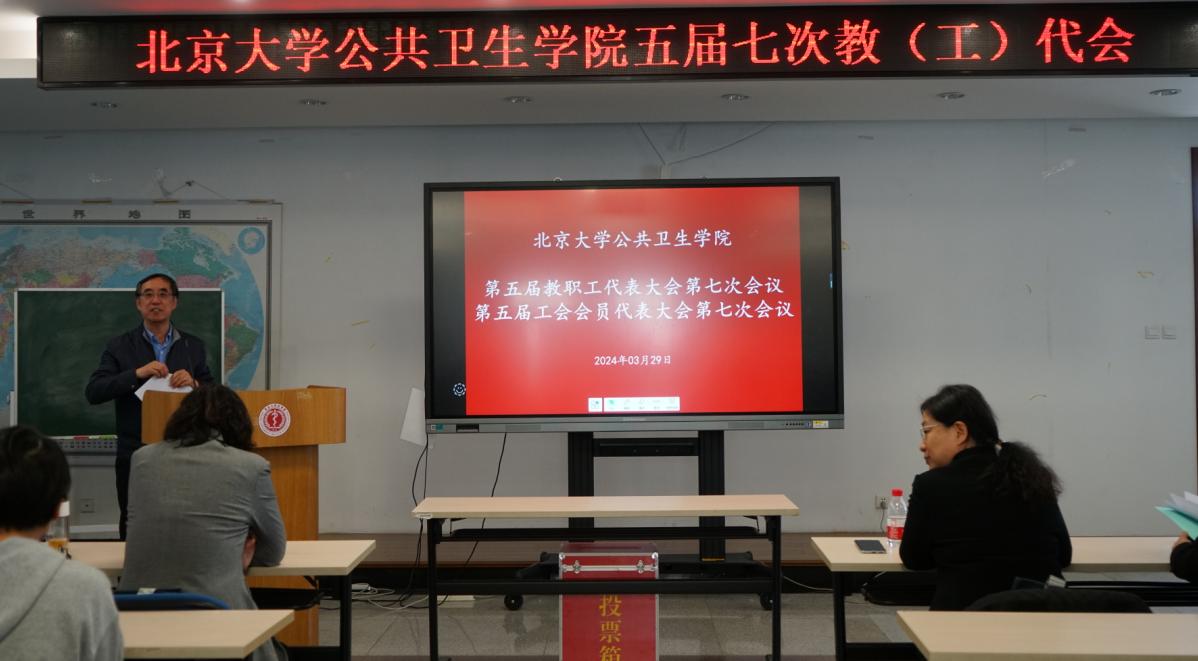 教代会常设主席团主席、公卫学院党委书记郝卫东向大会作《在yl6809永利官网第五届教职工代表大会第七次会议 第五届工会会员代表大会第七次会议上的工作报告》。报告分为两个部分,2023年工作回顾及2024年教代会、工会工作思路。将工作体验和思考融于过去一年工作汇报中。分别从强化思想引领、坚持用习近平新时代中国特色社会主义思想凝心铸魂,重视民主管理,多种形式发挥教代会主渠道作用,围绕中心、服务大局、切实发挥工会职能,以服务促发展、以发展促和谐、以和谐促提升,以活动之名、践活动之实、提高活动效果,我建我家、队伍建设在路上,六方面就学院教代会工会党管工会、讲政治、讲服务、重品质、抓建设进行汇报。介绍日常、福利、文体、教育、宣传、兴趣小组、建家工作等情况。指出,2024年教代会工会工作将在加强教代会制度建设及代表培训、提升民主参与、民主管理水平,丰富基层系室工会工作内容、重心下移、激发活力,加强福利工作、做好非在编、博士后入会工作,加强工会干部培训、不断提升工会干部队伍素质,四方面下力气落实、抓好。