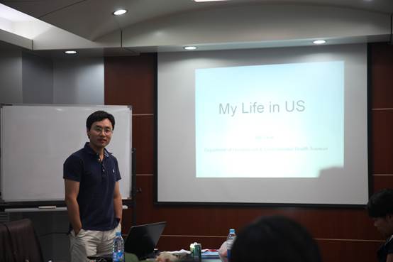 黄薇老师首先以流利的英语讲述了自己在美国十余年的求学生涯和工作经历,以及回国后在北大的工作生活经历。从美国东北大学攻读硕士到哈佛大学攻读博士,再到美国健康效应研究所和回国工作,求学路上如何选择自己喜爱的专业方向、学习与工作生活中的良师益友、家人生活的点滴快乐,让在座的老师和同学更加深入、全面地认识了解黄薇老师。之后,周辉老师讲述了自己在美国国家健康研究院(NIH)的博士后工作和生活情况,让大家形象地感受到NIH良好的工作氛围和与动物和谐相处的自然环境,周辉老师的幽默风趣感染了大家,时时爆发出愉快的欢笑声。两位老师主讲之后,大家对两位老师的研究课题和方向表现出极大兴趣,进行了相关提问,并对哈佛大学的教学要求和课程、美国NIH的工作情况、美国博士后的申请等问题进行了交流讨论。