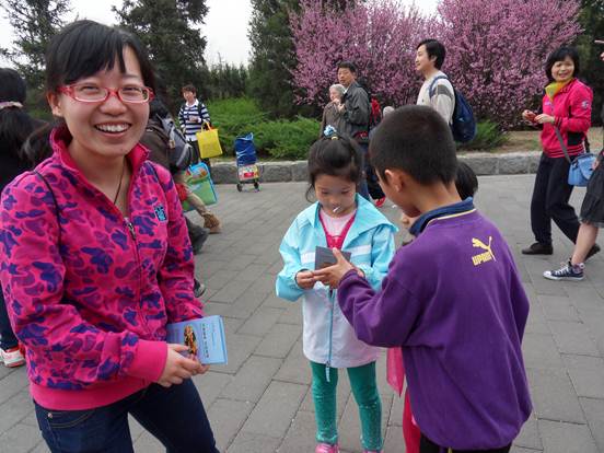北京植物园位于京西香山脚下,是国家级AAAA旅游景区、全国林业科普基地、全国青少年科技教育基地、中央国家机关思想教育基地。这天天气晴朗,空气清新,能见度高。早上七点四十同学们一起坐上了696路公交车,约于早九点就到达了景区。进入景区后,大家便分散开来向游客分发我们提前印制好的“合理营养,平衡膳食”宣传页。宣传页中介绍了中国居民膳食指南,膳食宝塔还有各种食品营养常识,有的拿到宣传页的家长还兴致勃勃的对小朋友进行了营养教育。