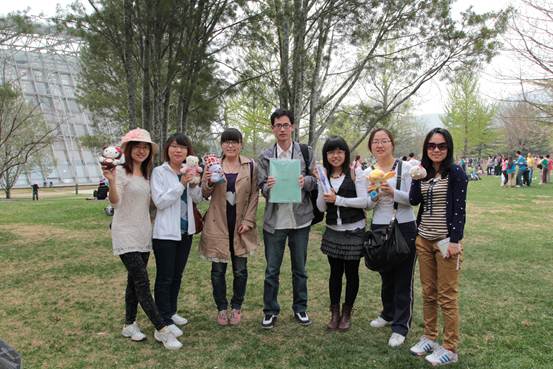 上午十一点半左右,大家围坐在一片草地上,一边“共产”式聚餐,一边做智力游戏,既填饱肚子又放松心情。午饭后大家继续前进,观赏路边的风景。小桥流水,随处可见。不时有游人走到桥下,观察水中的鱼儿。随着地形的变化,各个花园的建造错落有秩,风格各异。牡丹园因地制宜,借势造园。以原有油松为基调树种,增加了园林古朴高雅的情调。在南面的入口处有三组山石,六株百年以上的国槐。月季园以展示不同类型月季在不同环境中的多种配置形式为主,中部是音乐喷泉广场。藤本区在轴线上矗有月季园主景雕塑--花魂。