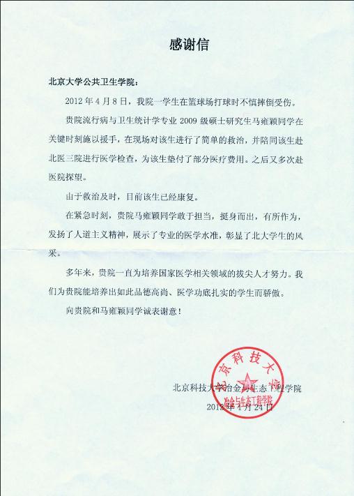 北京科技大学冶金与生态工程学院对马雍颖同学的敢作敢当,挺身而出,有所作为进行了表扬,对我校能培养出具有专业的医学水准和高尚的道德品德的学子表达了感谢。