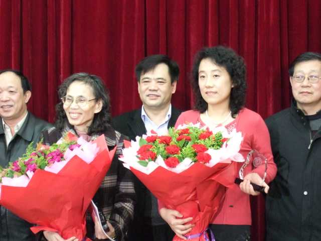 三月六日下午医学部工会活动中心喜气洋洋,医学部十位的女教工之星,正在接受医学部领导以及工会领导的表彰,并由各级工会的男领导向她们献上节日的鲜花。