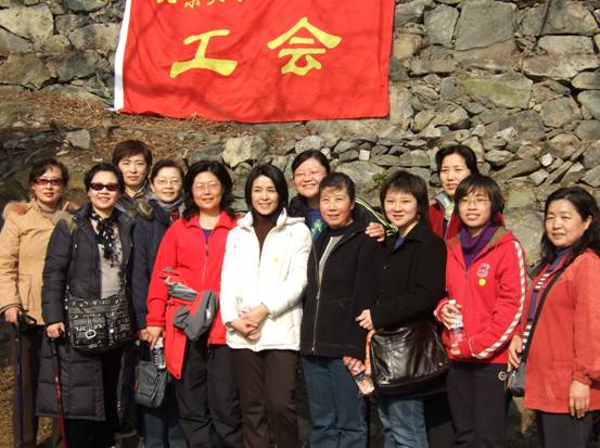 登鹫峰的路要比以往三八节登香山、八大处困难的多。通往上山的路是由各种形状的石块垒成,路窄、坡陡、台阶高低不平、不均,一不留神就会摔倒、歪脚。尽管如此我们这些女同胞们还是勇敢的爬上去了。看她们红光满面、神采奕奕、获胜征服的喜悦挂在脸上。马迎华书记积极带头参加,蔡老师、李老师柱着登山杖也登上去了。