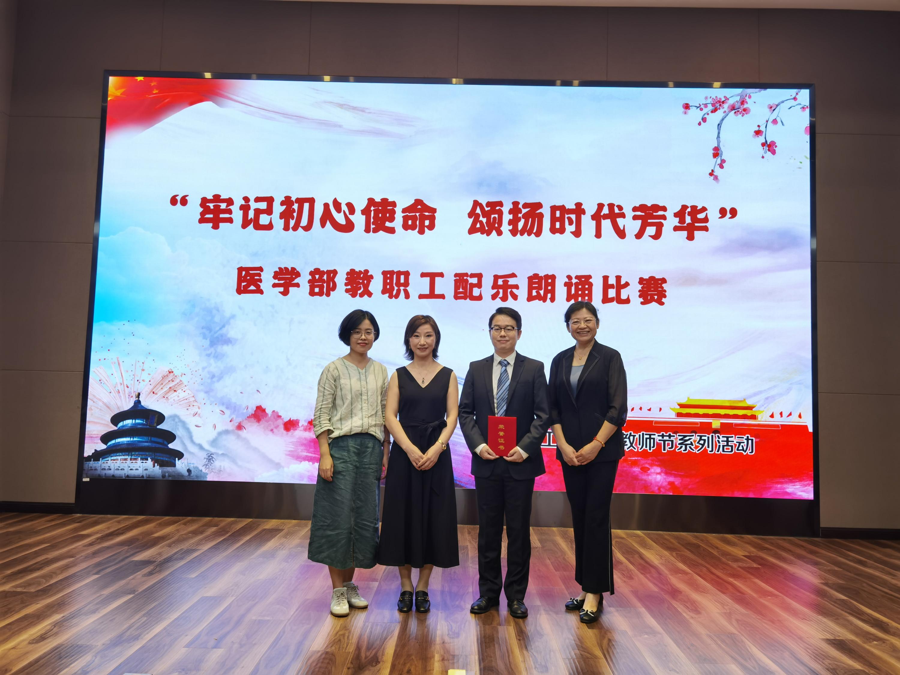 2021年9月10日下午,为庆祝第37个教师节和中国共产党成立100周年,医学部工会组织开展了“牢记初心使命,颂扬时代芳华”教职工配乐朗诵比赛活动。中国卫生发展研究中心工会小组的汪洋、胡丹两位老师以题为“最美——牢记初心使命,颂扬时代芳华”的朗诵作品代表公卫学院参加比赛并获得三等奖。