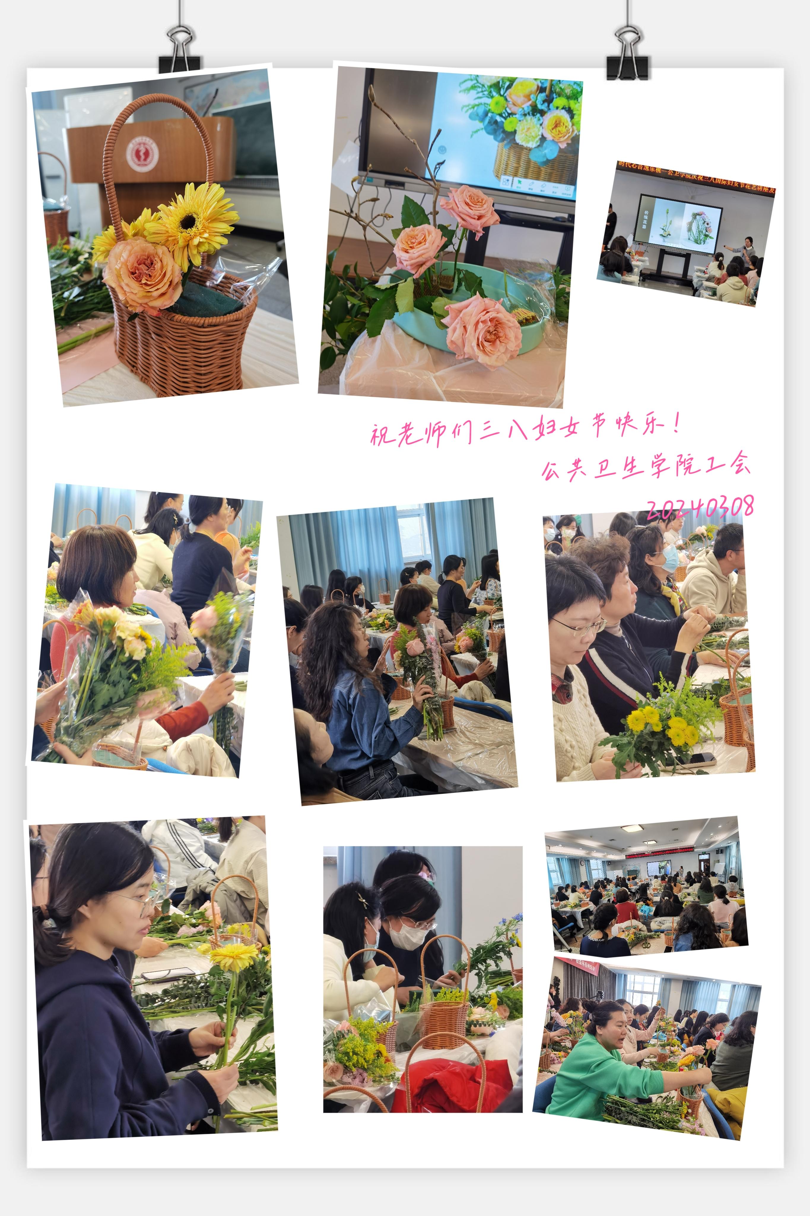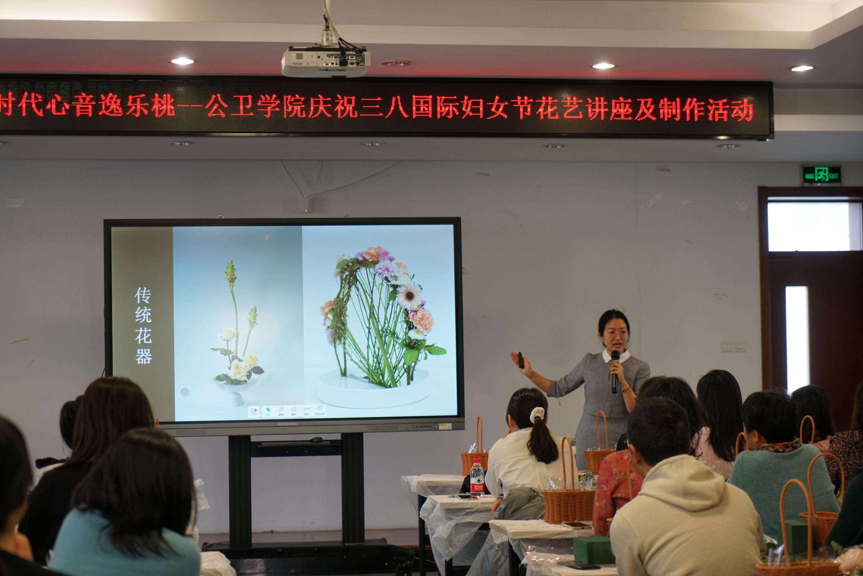 携一束鲜花,祝明日梦真。为庆祝第114个三八国际劳动妇女节,喜迎中华人民共和国成立七十五周年,2024年3月7日中午,公卫学院工会于卫三教举办“华章雅韵喜相逢 时代心音乐逸桃”——公卫学院庆祝三八国际妇女节花艺讲座及制作活动。